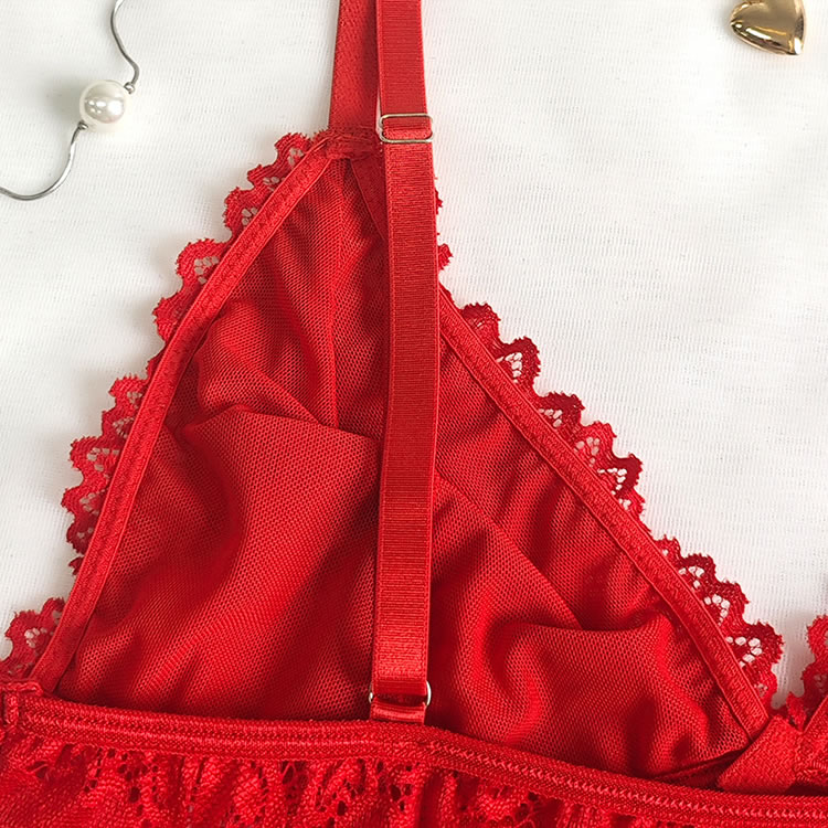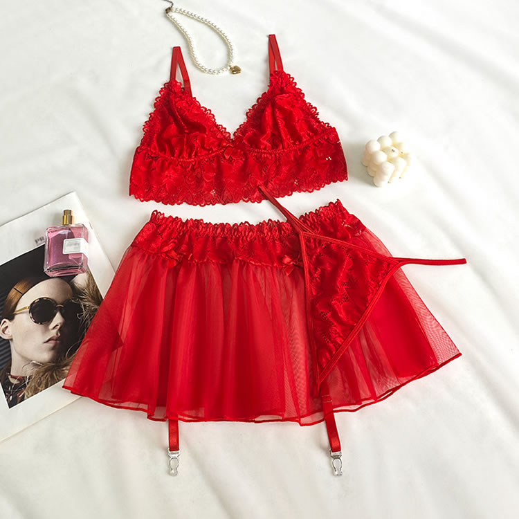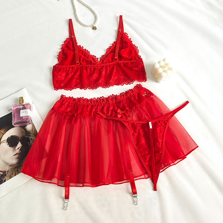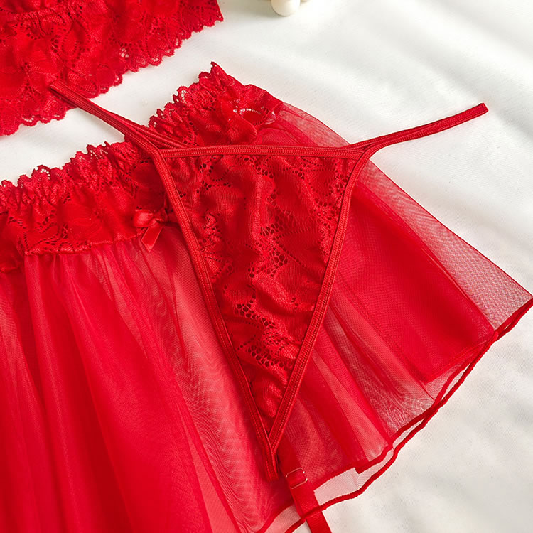 This vibrant red lingerie set combines a structured lace bra with a flirty tulle mini skirt for a look that’s both romantic and daring. The soft lace bra features scalloped edges, delicate floral lace detailing, and a bow accent at the center, offering support and style. Paired with a sheer, sexy tulle skirt that flares softly around the hips, it adds a whimsical touch to your intimate wardrobe. Designed with thin adjustable straps and garter-style side ties, this set blends vintage charm with modern flair—perfect for those who love to play with texture and silhouette.
