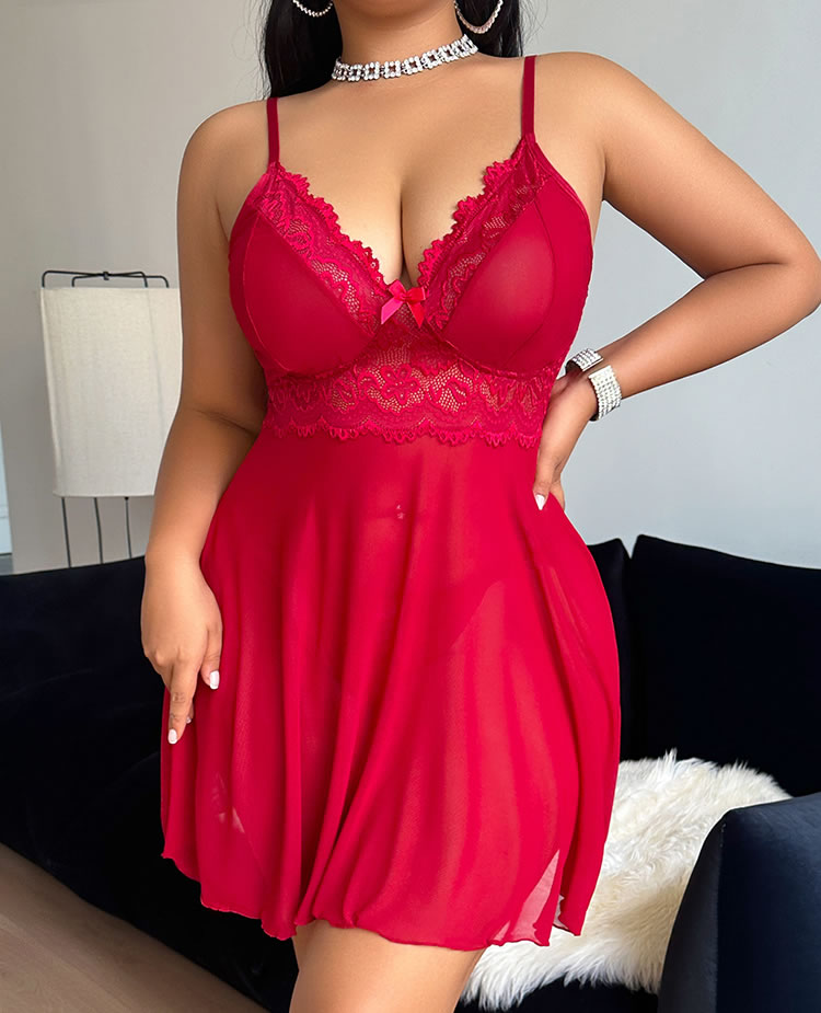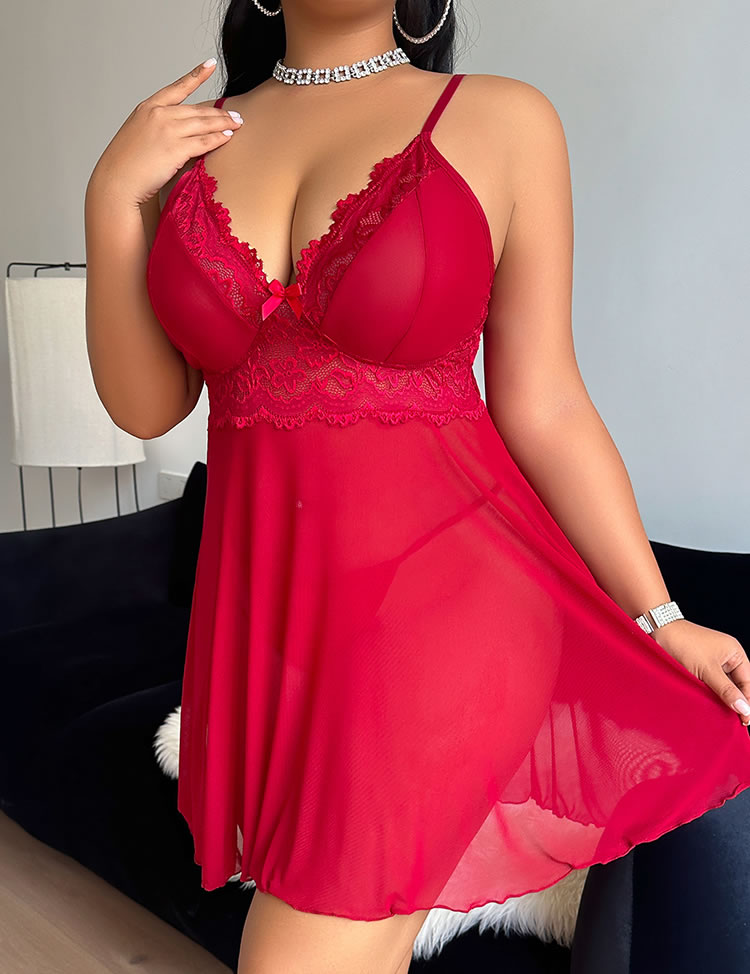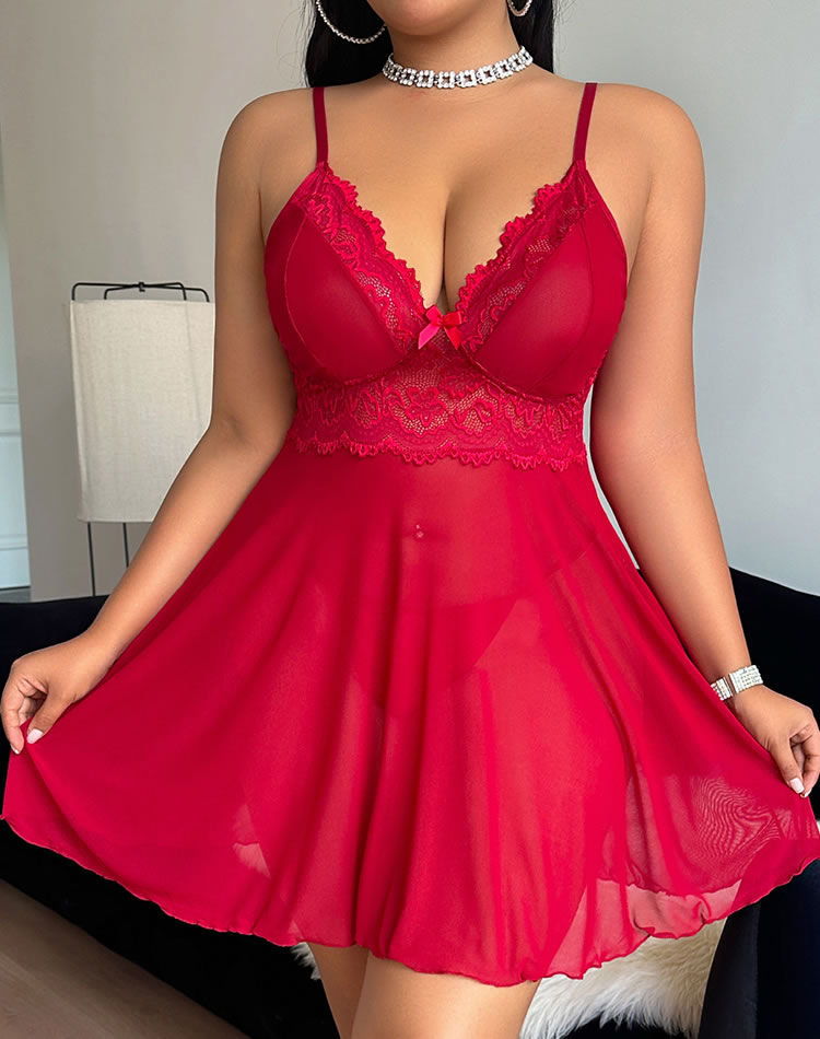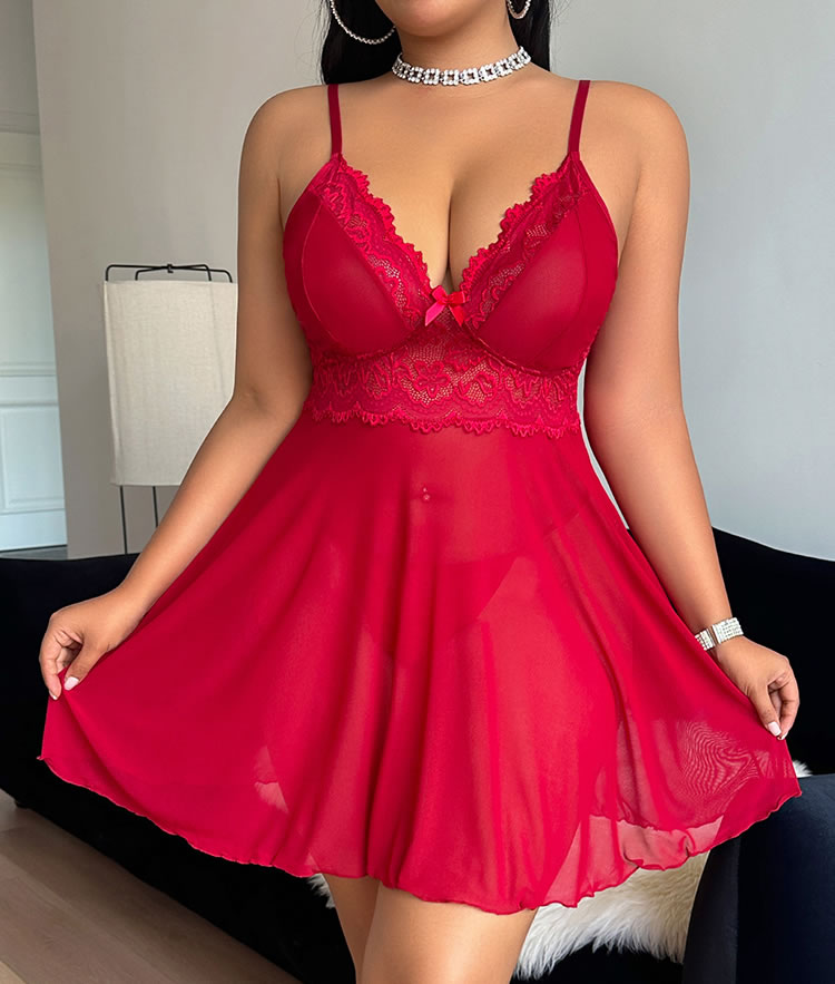 Turn heads with this vibrant red lingerie dress that blends romance and confidence. Featuring a deep V-neckline framed by delicate lace trim and a sweet bow at the center, it’s designed to highlight your curves with flair. The sheer mesh bodice flows into a soft, flared skirt that adds movement and charm—perfect for creating an unforgettable impression on special nights.