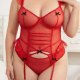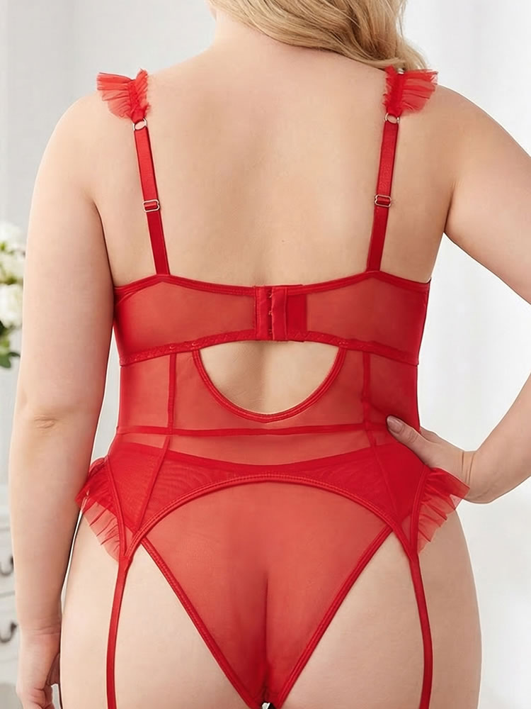 Turn up the heat with this playful red plus-size chemises. This sheer chemises features a peekaboo design soft cups for support and a deep V-neckline. The bodysuit is adorned with cute black bows and delicate tulle ruffles on the shoulders, adding a feminine touch. The waist features vertical ruching for a flattering fit, while the open sides and attached garter straps create a daring, pin-up inspired look that pairs perfectly with stockings.