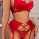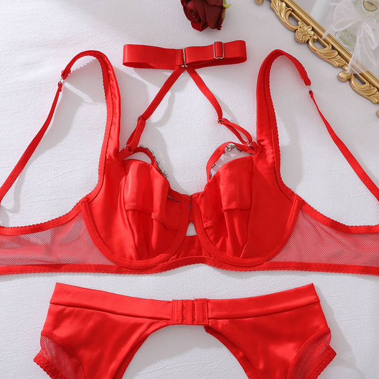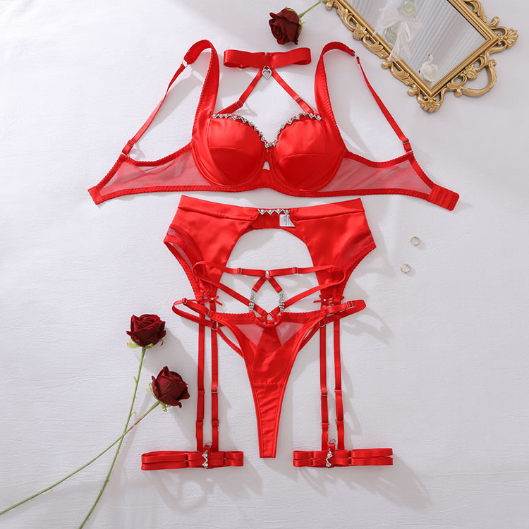 Ignite passion with this stunning red lingerie set, designed to captivate and entice. The vibrant red fabric is accented with sparkling rhinestones along the bust and straps, adding a touch of glamour to a bold look. This set features a supportive bra with a strappy harness design connected to a matching choker, while the high-waisted garter belt includes a unique skirted overlay and adjustable straps for the stockings. Perfect for a special night, this ensemble combines edgy style with feminine allure.