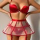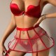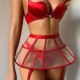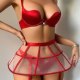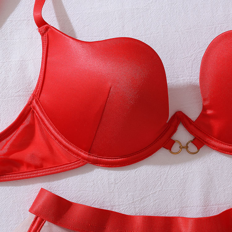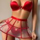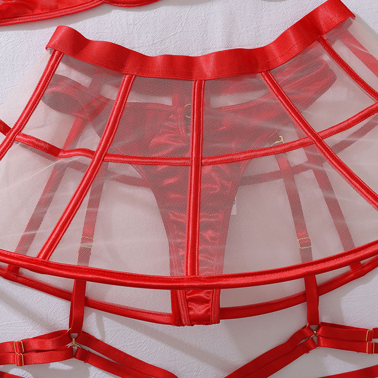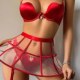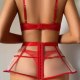 Make a bold statement with this captivating red lingerie set. This three-piece ensemble features a smooth, satin-finish underwire bra with a central gold ring accent for a touch of sparkle. The highlight of the set is the sheer mesh mini-skirt, structured with satin ribbon to create a daring cage-like effect that reveals the matching thong underneath. Complete with adjustable garter straps, this set is designed to accentuate your curves and add a playful, seductive flair to your intimate moments.
