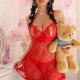 Embrace a bold and romantic aesthetic with this sheer red babydoll chemise. Crafted from a delicate see-through mesh adorned with an all-over heart pattern, this piece offers a playful and flirtatious look. It features adjustable spaghetti straps and a low-cut neckline for a classic silhouette. The open back design adds a touch of teasing elegance, making it a perfect choice for special occasions or adding a pop of color to your nightwear collection. Pair it with the matching thong for a cohesive set that highlights your curves.