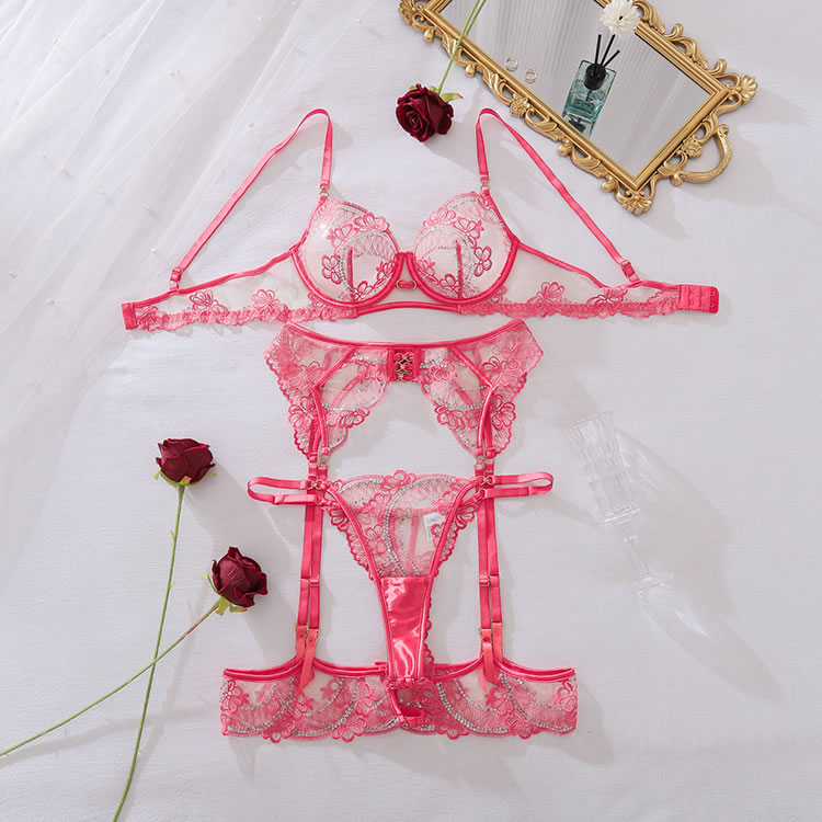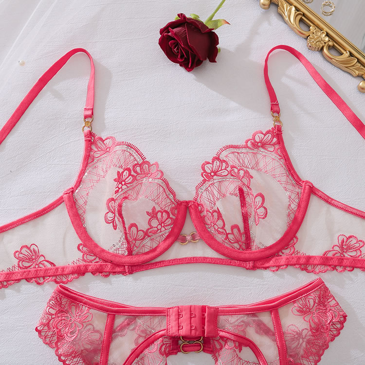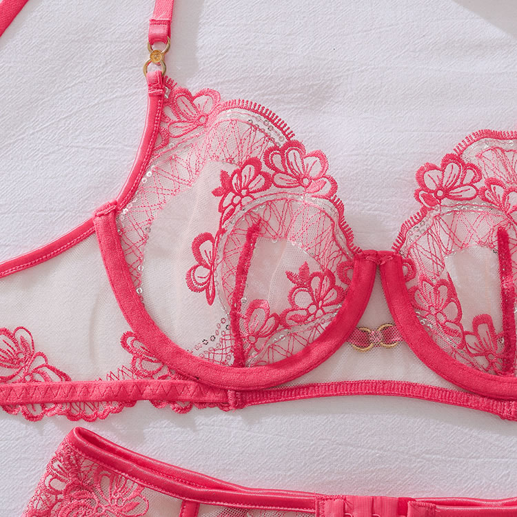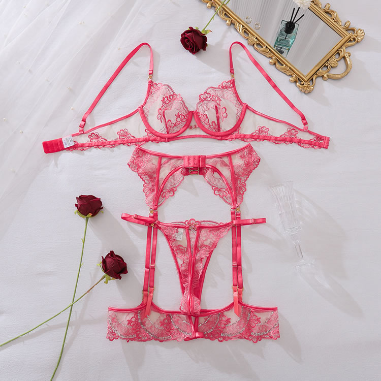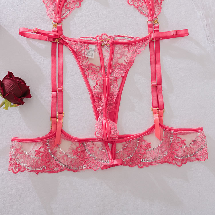 Turn up the heat with this fiery red lingerie set, designed for maximum impact. This three-piece ensemble features a balconette bra and a matching garter belt, both crafted from sheer mesh and adorned with intricate lace and sparkling sequin details. The strappy thong create a bold and revealing silhouette, while the attached garter straps connect to matching lace-trimmed thigh bands for a complete and captivating look.
