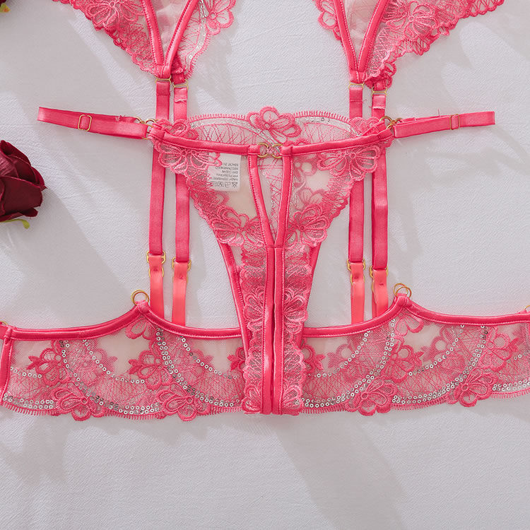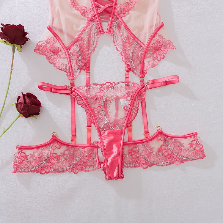 Ignite passion with this stunning red lingerie set, designed to captivate. The sheer chemises features intricate lace embroidery along the bust and hips, offering a teasing yet elegant look. A corset-style front cinches the waist for a flattering silhouette, while the thong back ensures a seamless fit. Complete with matching garter straps, this set is the perfect choice for a romantic and unforgettable night.