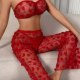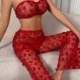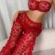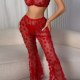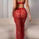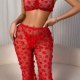 This eye-catching two-piece set combines a strapless bustier with a high-waisted, flared pant in sheer red mesh adorned with raised floral details. The top with a sweetheart neckline, while the full-length pants feature an elegant flare that adds movement. Designed to draw attention with its bold color and intricate texture, it’s perfect for those who want to make a statement with confidence and flair.
