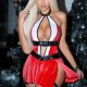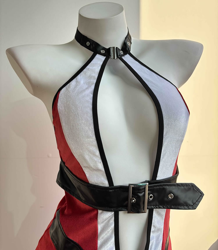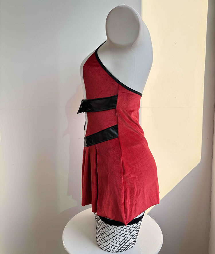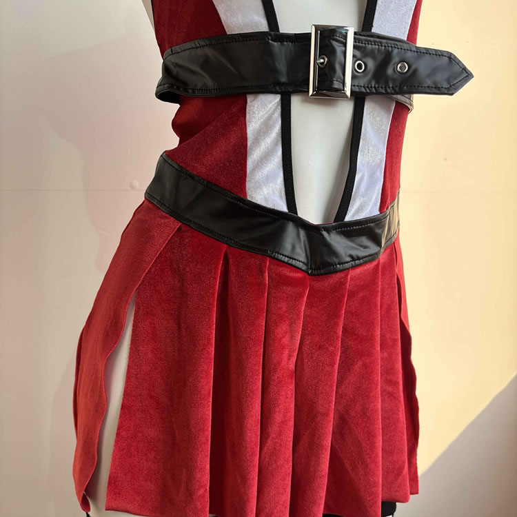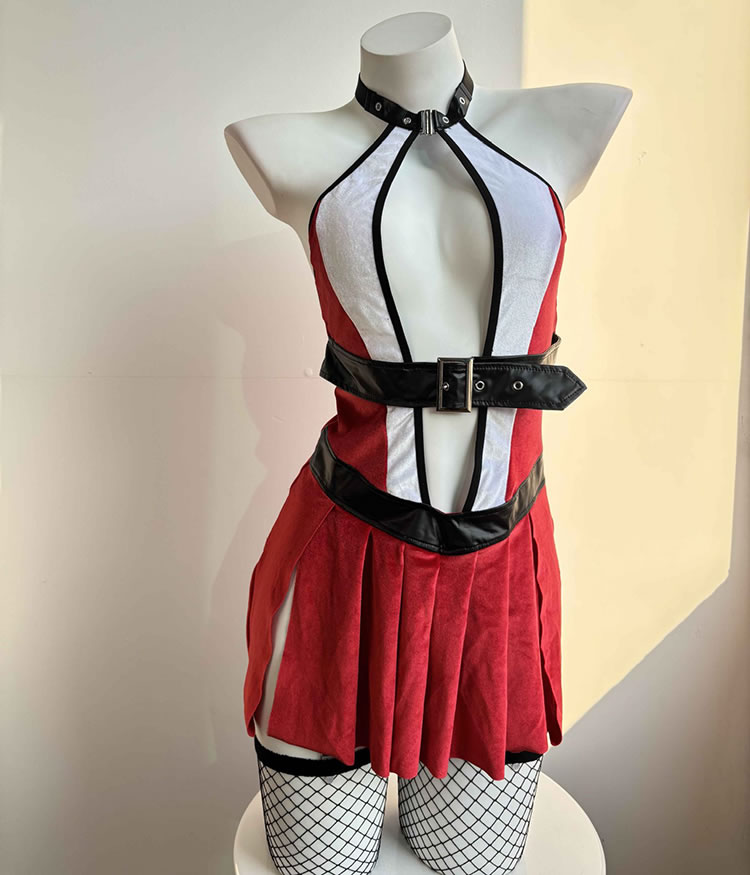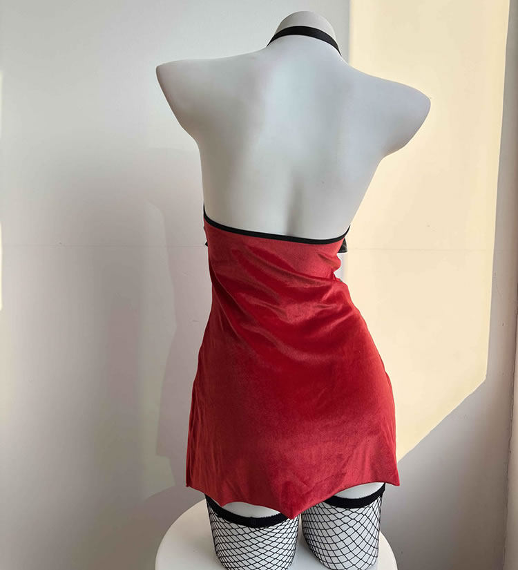 Get into the holiday spirit with this daring red and white lingerie dress that blends Christmas charm with sultry style. The halter-neck bodysuit features a deep plunging neckline and a structured fit that hugs every curve. Contrasting black faux leather straps wrap around the waist, adding a bold accent that ties the look together. The flared velvet mini skirt includes a high slit on one side, offering both movement and a hint of allure. Perfect for themed parties, Christmas Eve celebrations, or when you want to stand out in your own home.