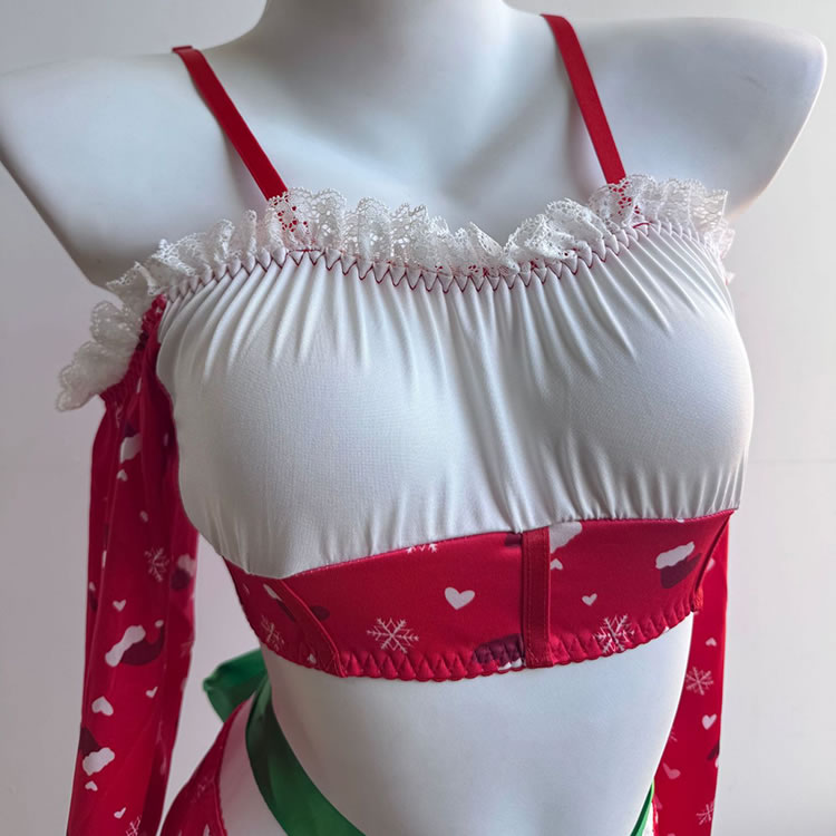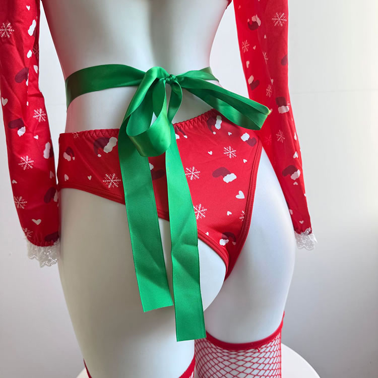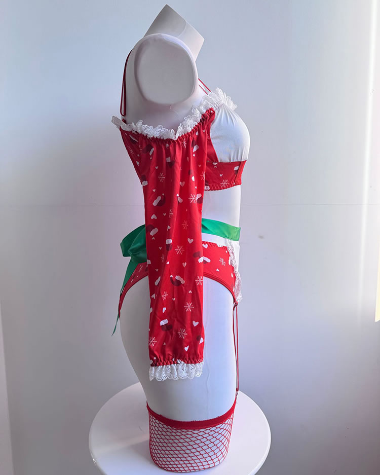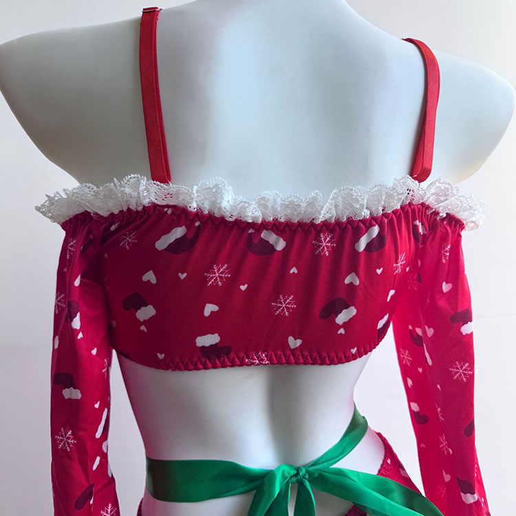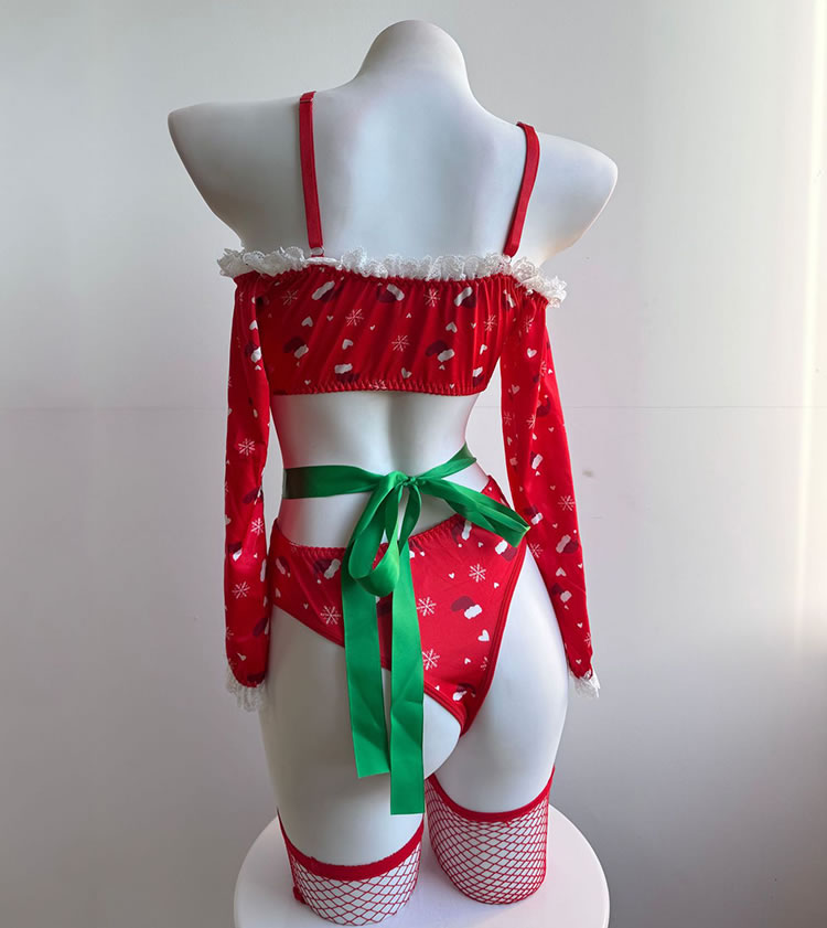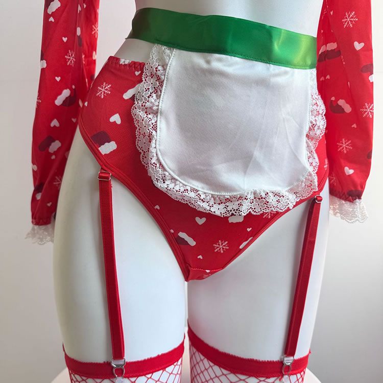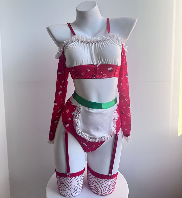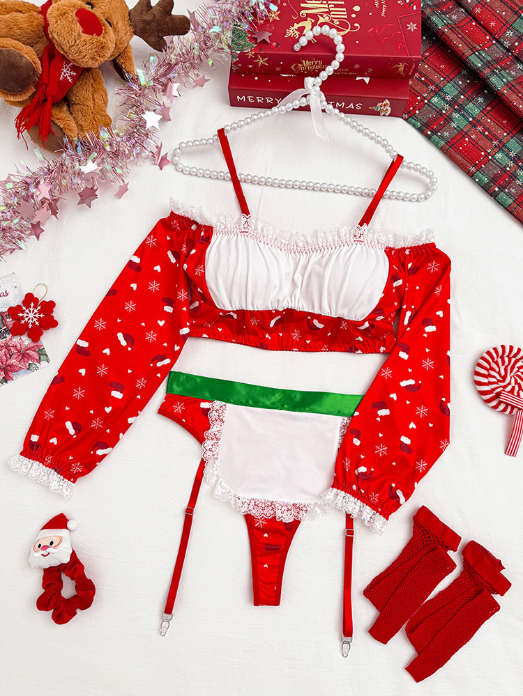 Bring a touch of holiday cheer to your nightwear with this adorable red and white lingerie set that blends vintage vibes with modern flair. The off-the-shoulder top features long sleeves with candy cane and snowflake prints, adding a whimsical Christmas twist. A soft white bralette sits beneath, framed by delicate lace trim and supported by thin red straps. Paired with matching red briefs and a classic white apron-style front panel, it completes the look with a playful maid aesthetic. The set includes garter straps to hold fishnet stockings in place, making it perfect for themed parties, cozy nights, or festive celebrations.