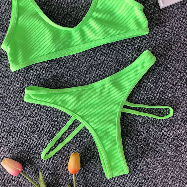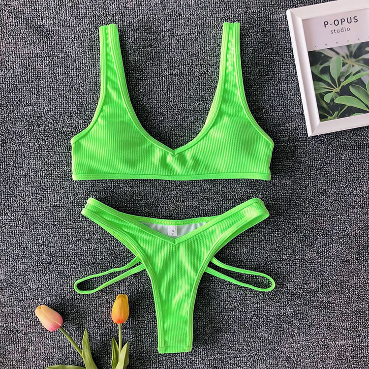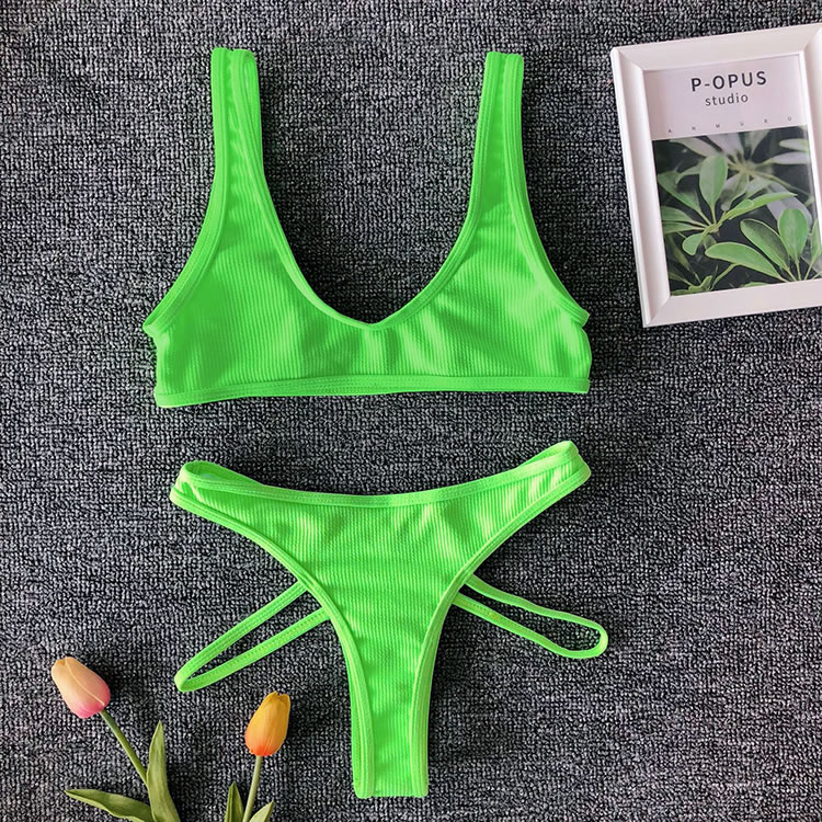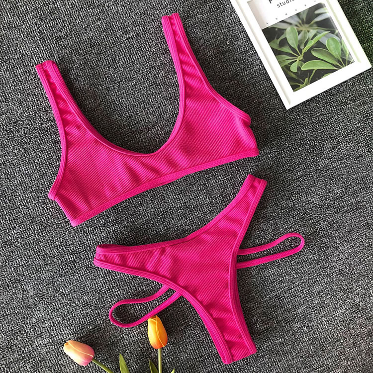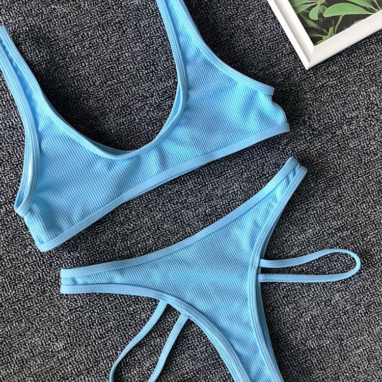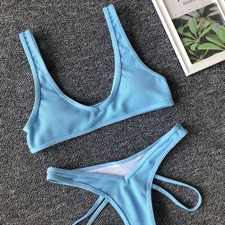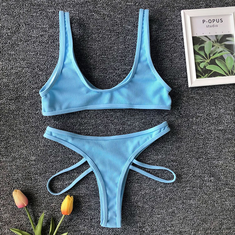Savor the salty air in this exclusive bikini top swimsuit featuring a sweetheart neckline, shoulder straps, a scoop back, a stretchy vertical ribbed fabric for a supreme fit and ultra comfort, and a matching bottoms with a low cut front, high cut sides with strap detail, a thong cut back,