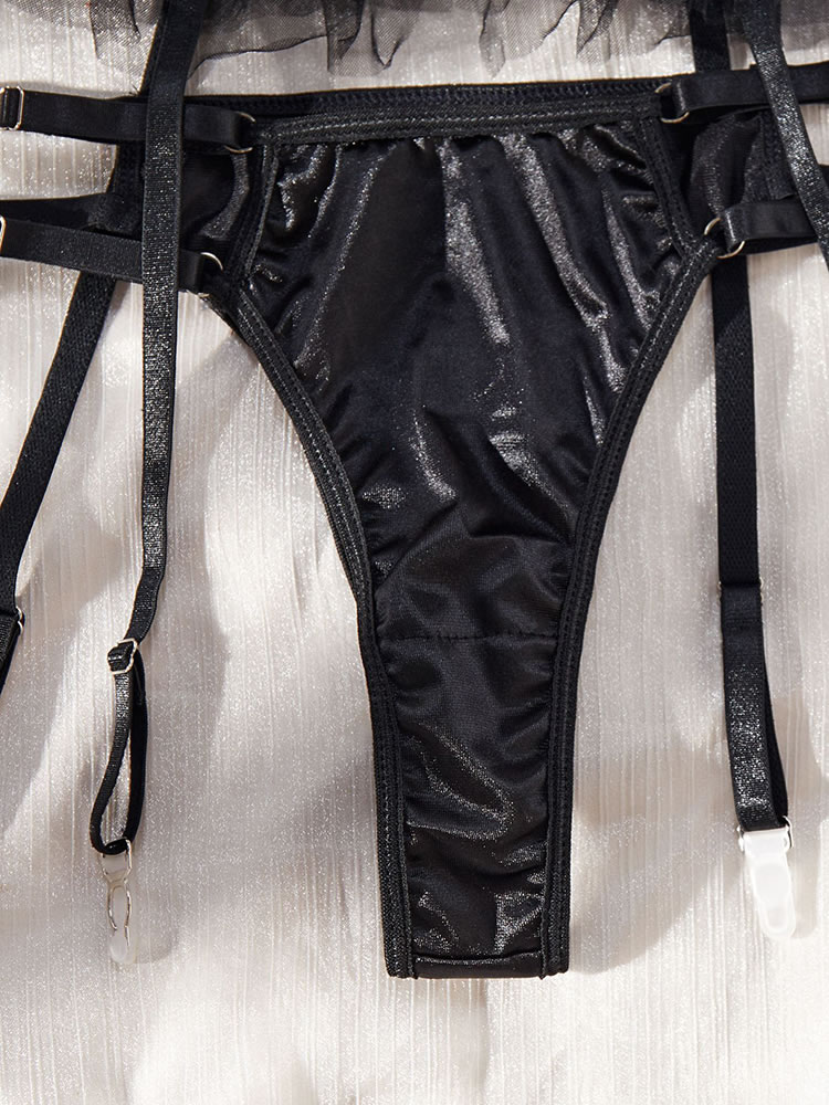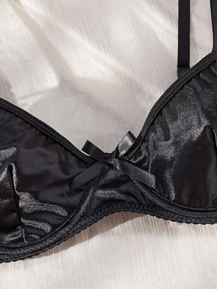 This bold lingerie set combines smooth satin fabric with delicate sheer mesh accents for a modern and daring look. The underwire bra features a deep V-neckline and a central bow detail that adds a touch of romance. Paired with a high-cut garter that includes a layered tulle trim and adjustable garter straps, it creates a cohesive and edgy silhouette. Designed to highlight curves, it’s ideal for intimate evenings or themed occasions.