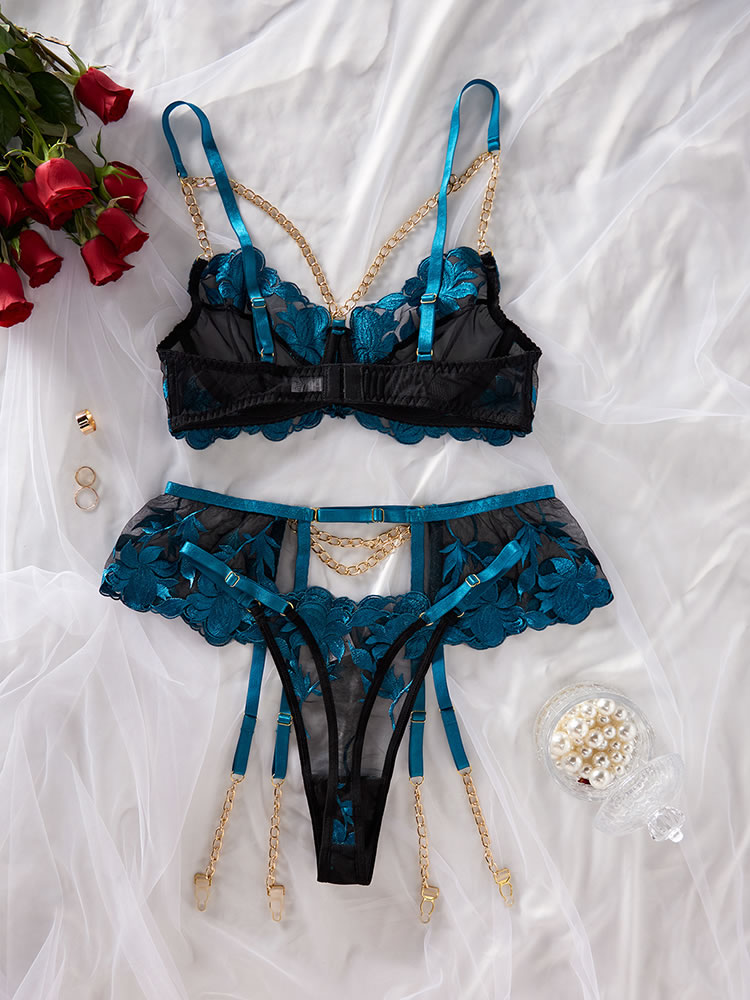 Tease your lover with this gorgeous bra set featuring sheer, embroidered lace, underwire cups, adjustable spaghetti straps, a hook and eye back closure, a matching garter belt with a back hook closure and adjustable garter straps, and a matching thong.