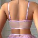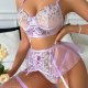 This charming lingerie set features a delicate floral lace design in soft lavender hues. The bra boasts intricate embroidery and a sweet bow at the center, while the matching garter belt adds a touch of vintage allure. This ensemble is perfect for those who appreciate both style and comfort.