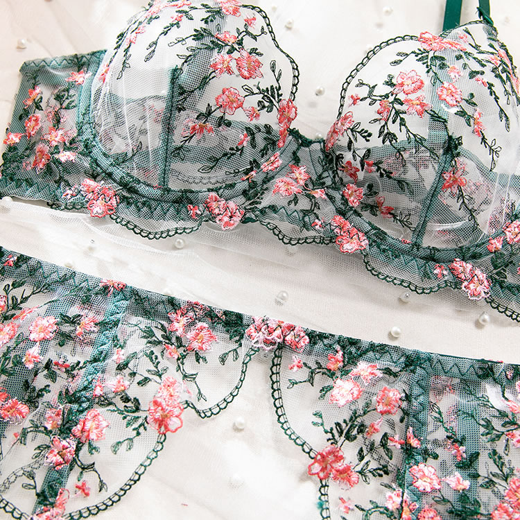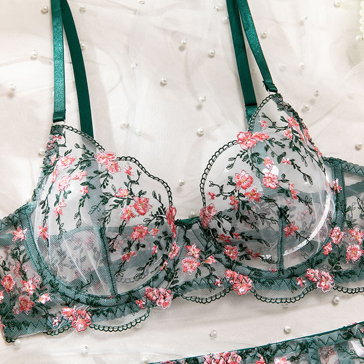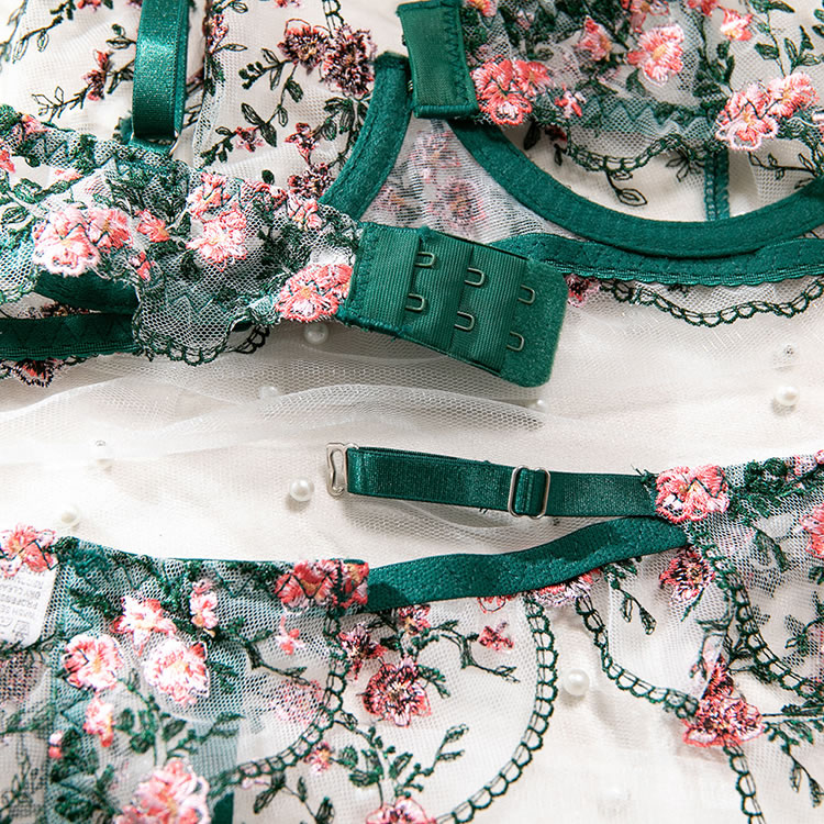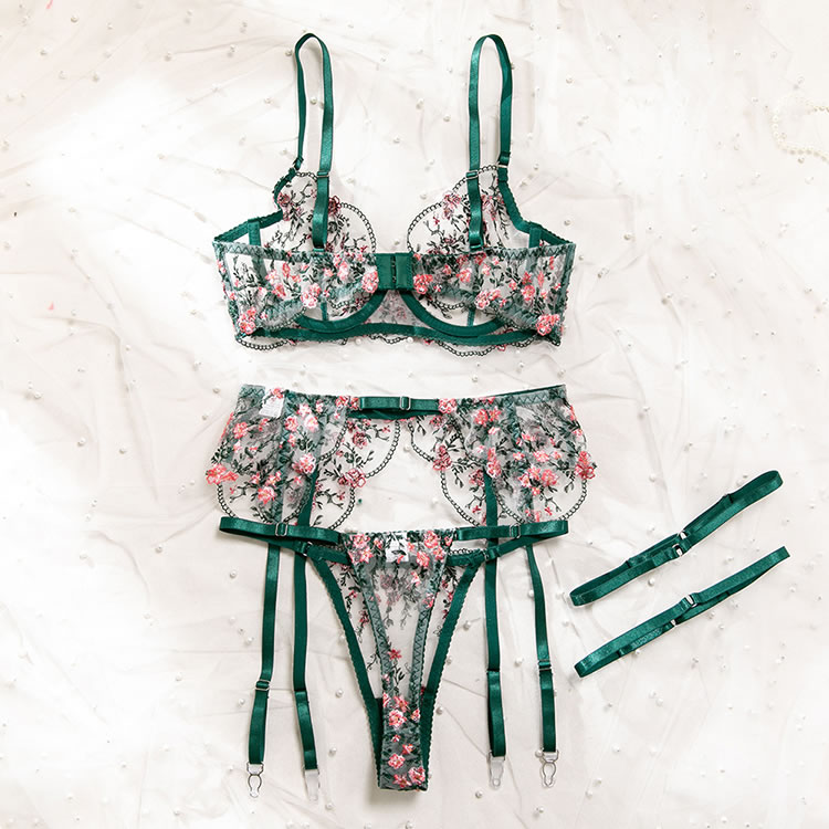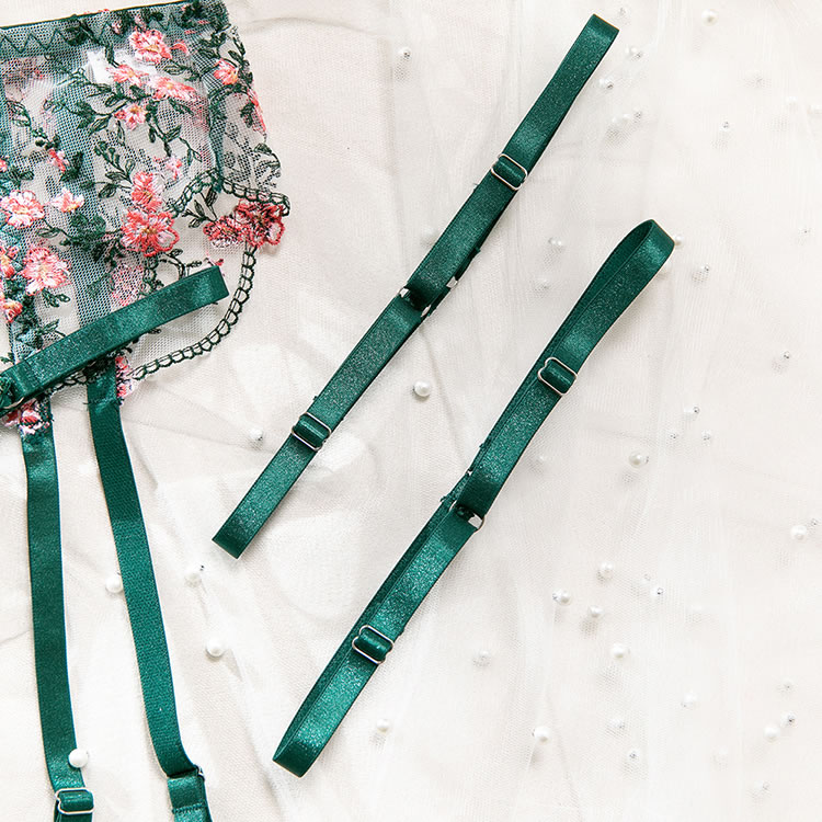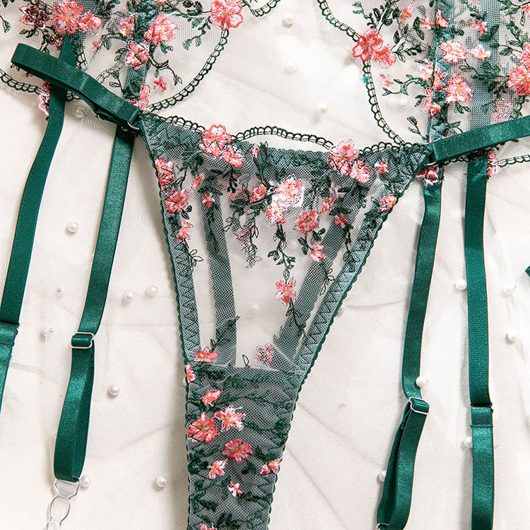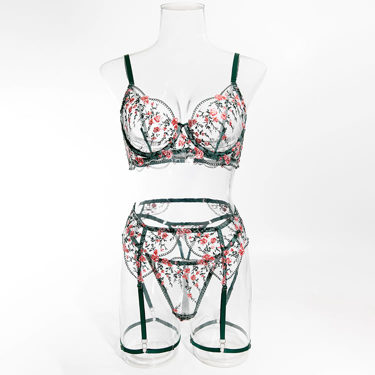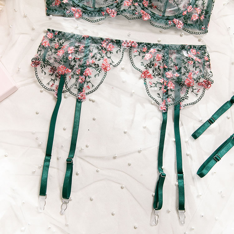 Embrace romance with this beautifully designed floral lingerie set. The bra showcases an elaborate floral pattern that extends to the matching garter belt and panties, adding a sense of cohesion and allure. The sheer material ensures breathability and comfort, making it ideal for special occasions or everyday wear. This ensemble combines sophistication with playful details.