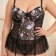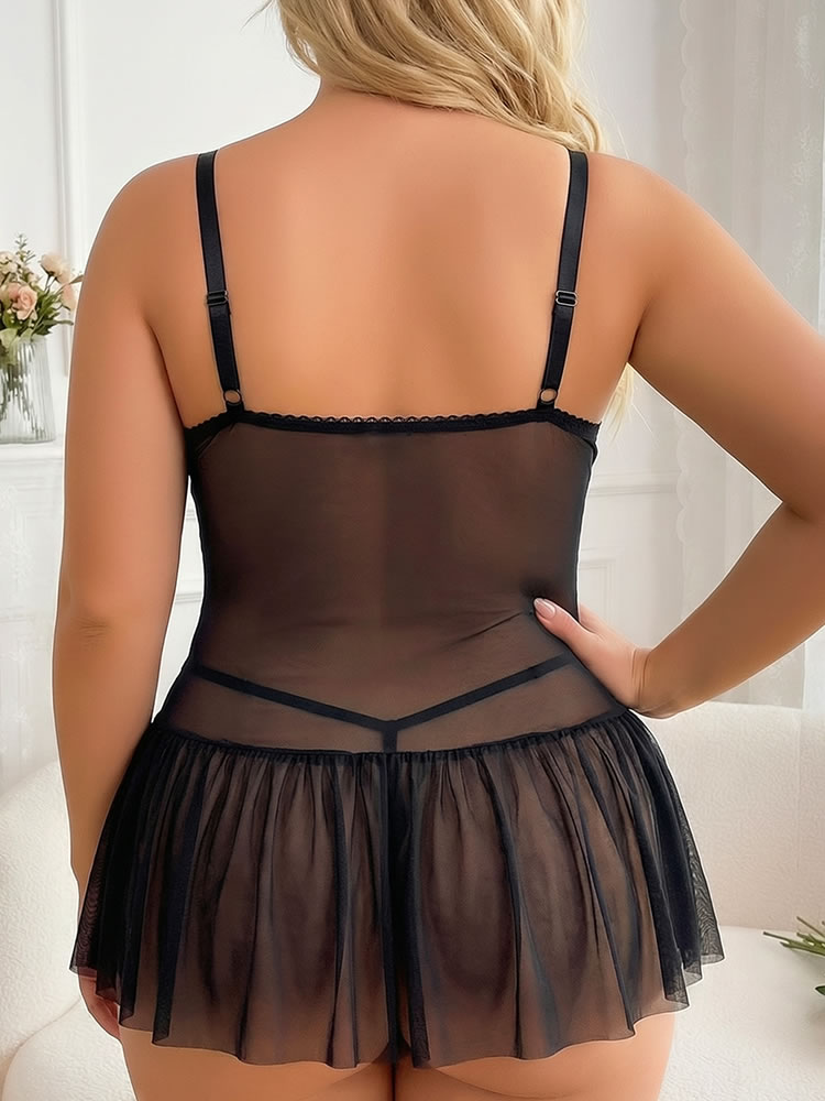 Designed for curves that love detail, this babydoll blends translucent fabric with handcrafted embroidery and adjustable side lacing for a customized silhouette. Thin shoulder straps keep it light, while the built-in brief and attached garters make it functional as well as beautiful. Ideal for those who enjoy feminine flair, playful elegance, and intimate moments wrapped in artful design.