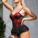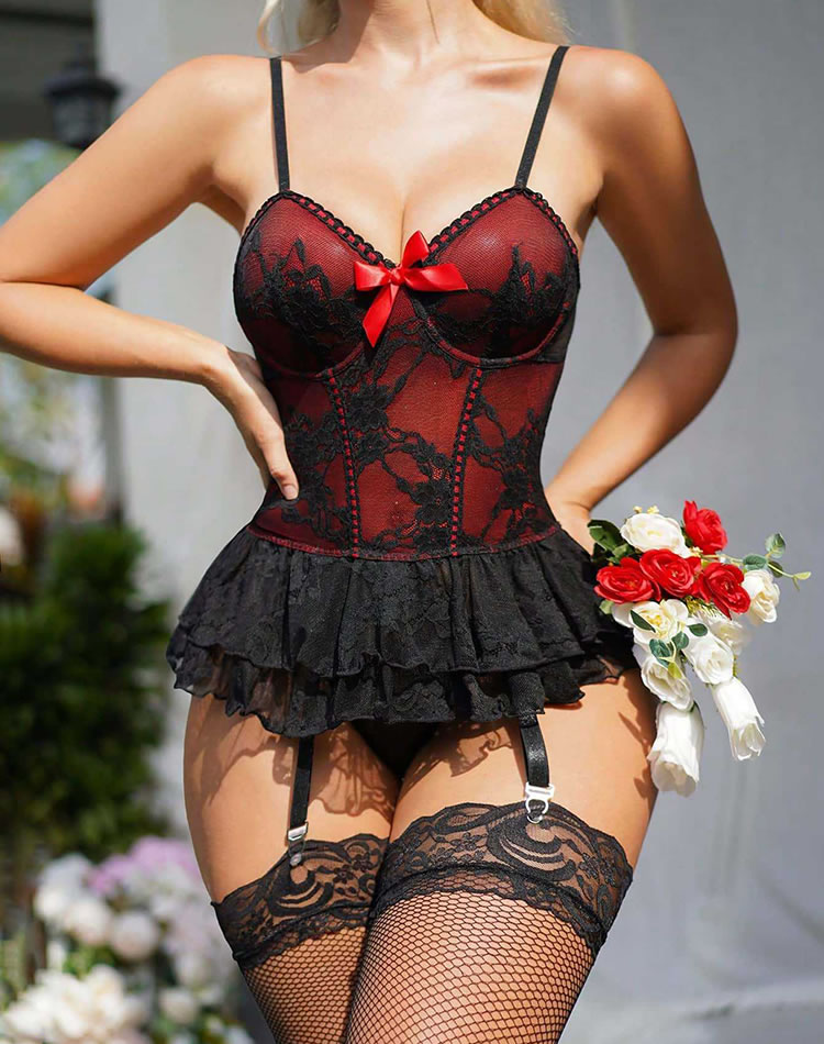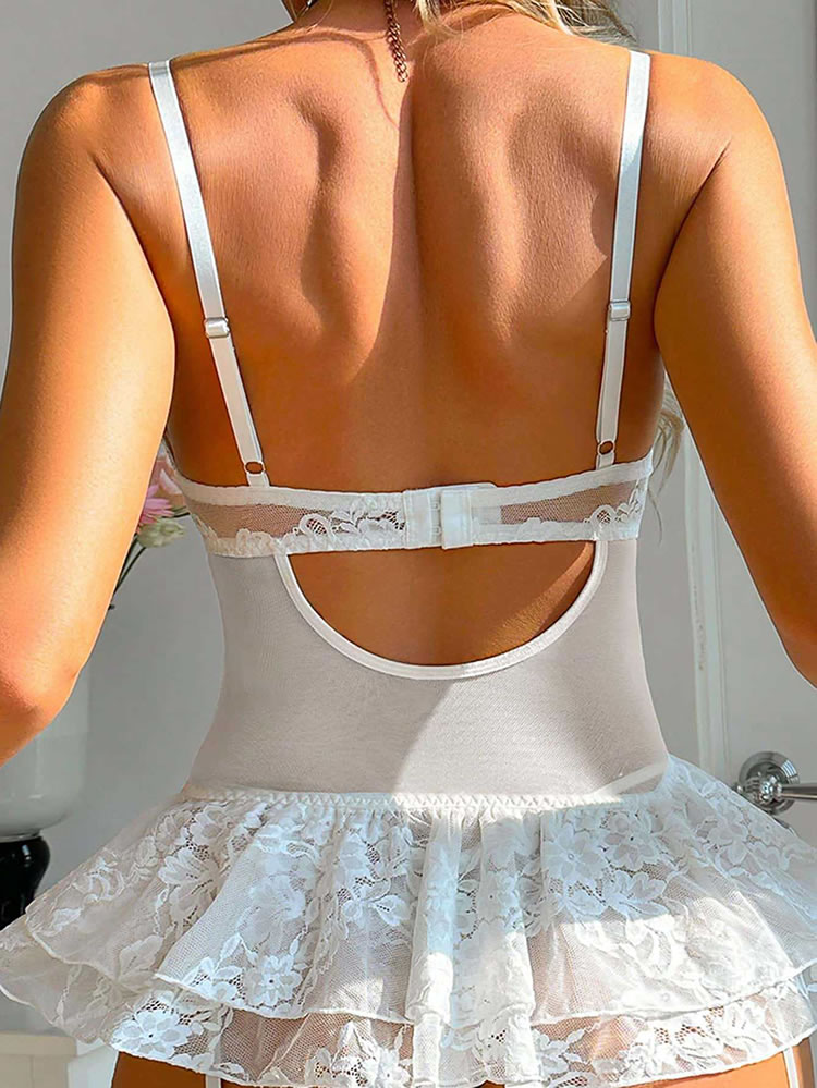 This delicate lingerie set features a soft pink and white color scheme with intricate lace detailing and a sweet bow accent at the center. The corset-style chemises includes thin spaghetti straps, a structured bustier top, and a flared ruffle hem that adds a touch of playfulness. Attached garter straps hold matching fishnet stockings in place, creating a cohesive and romantic look. Perfect for special moments or adding a feminine flair to your intimate wardrobe.