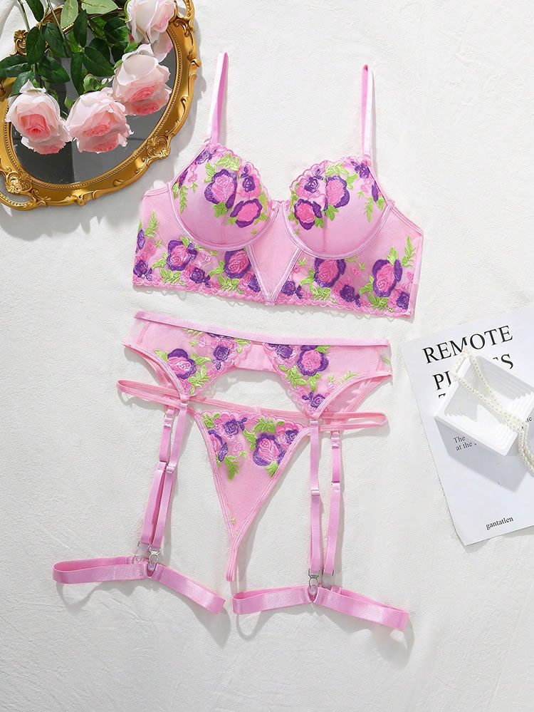 This charming lingerie set features a bold pink base adorned with vibrant purple and green floral embroidery. The underwire bra offers support and shape, while the matching garter belt connects to adjustable satin garters for a classic pin-up look. The back lace-up detail adds customizable fit and visual intrigue — perfect for themed nights or confident self-expression.