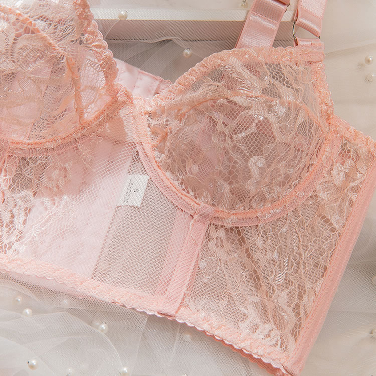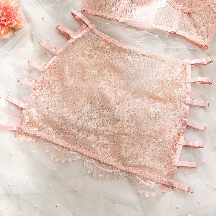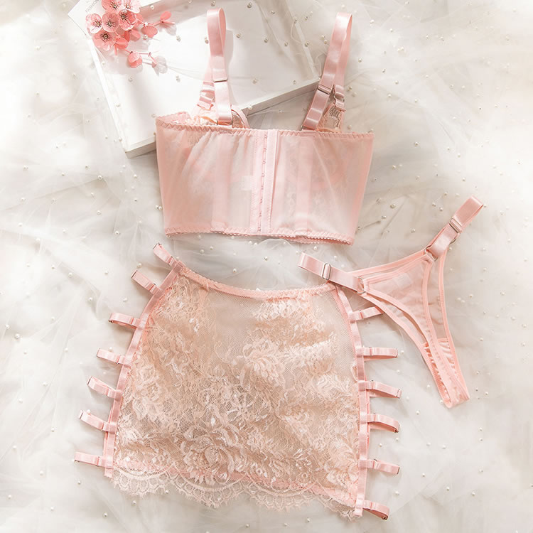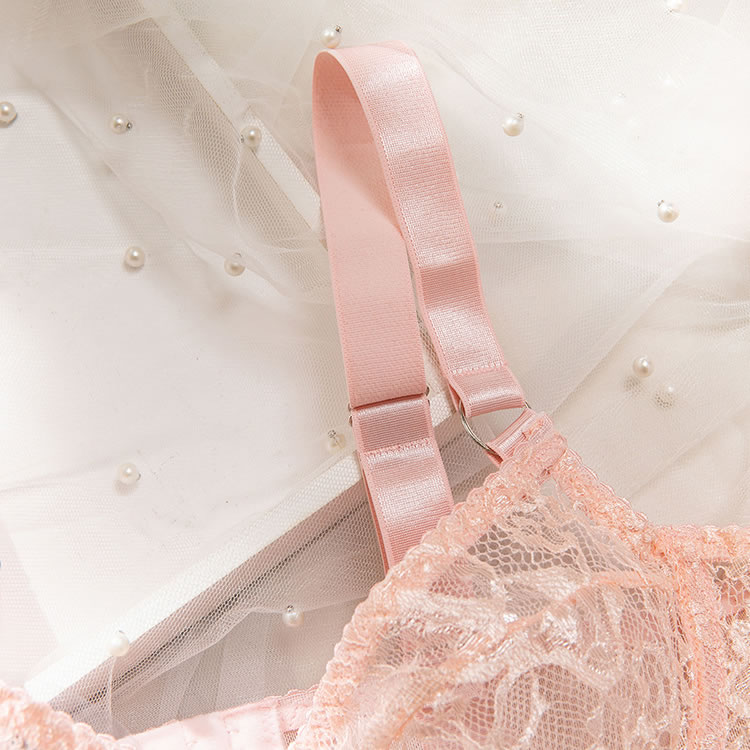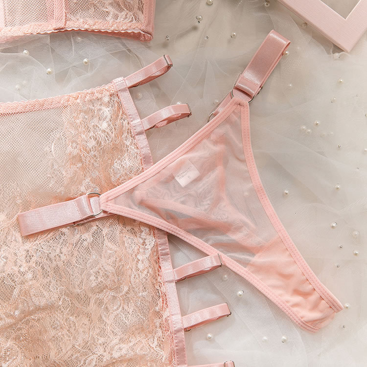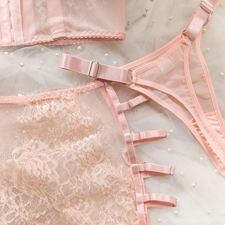 Step into romance with this pink intimates ensemble. The bra set showcases delicate floral embroidery that enhances its appeal, paired with sheer fabric for added charm. The design offers a soft and airy feel, ensuring both style and comfort. Ideal for adding a captivating and playful vibe to your lingerie collection.