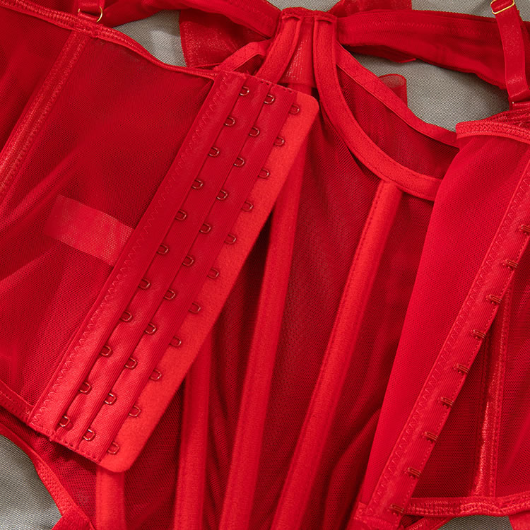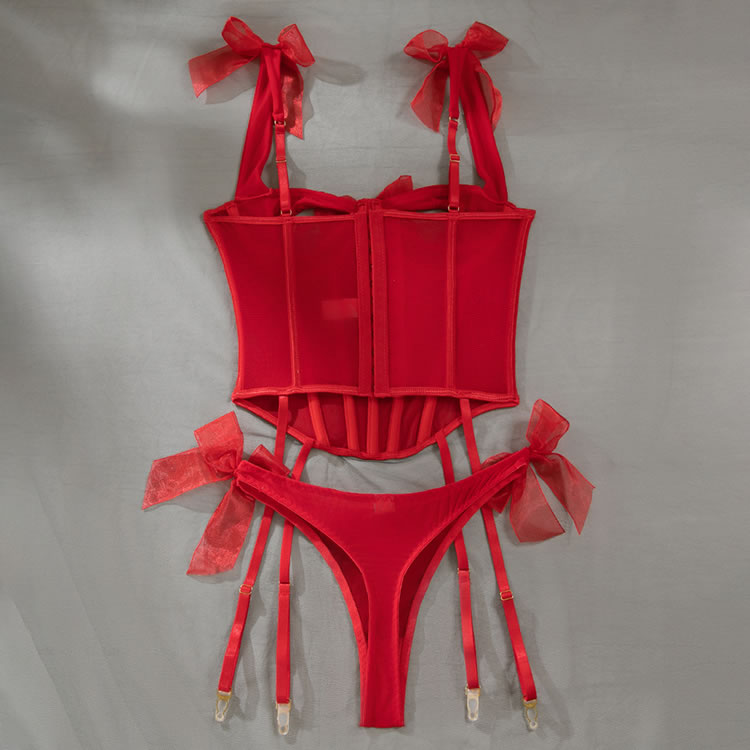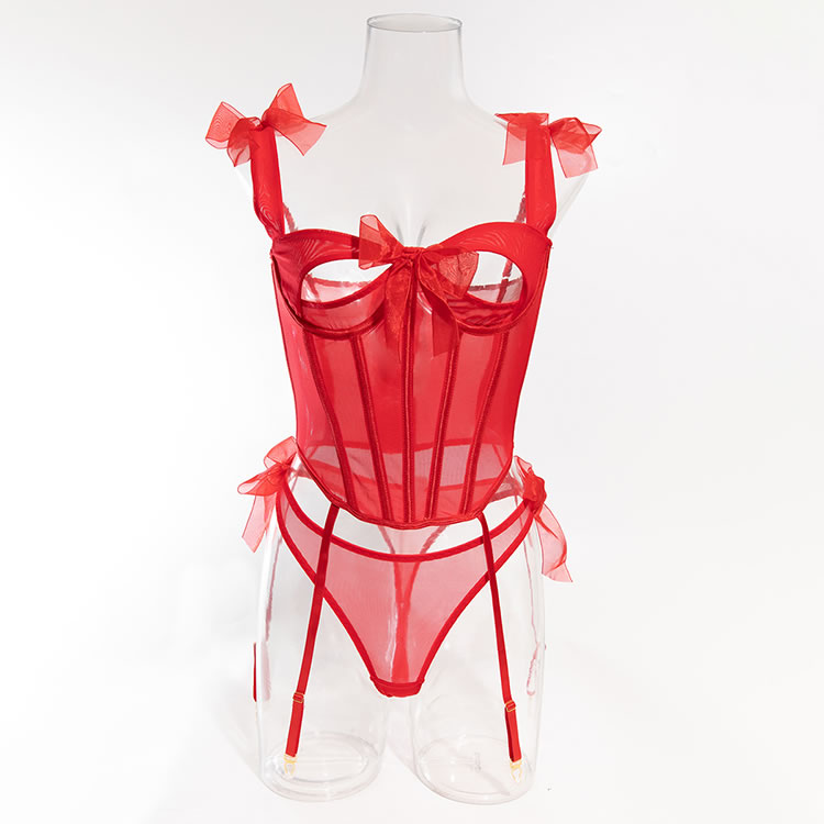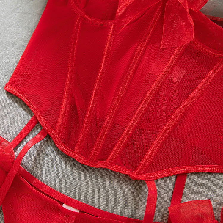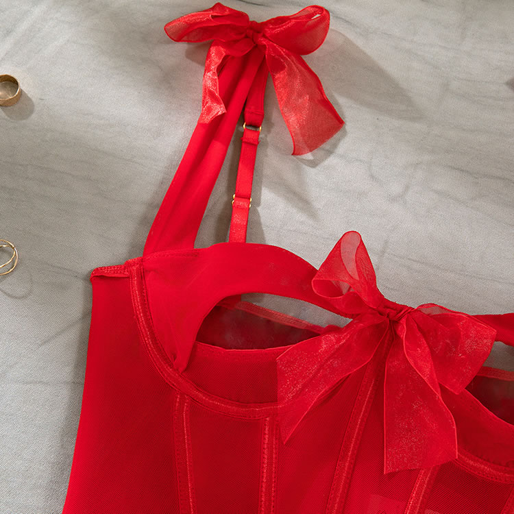 This exquisite lingerie set features a stunning red design with intricate detailing. The sweetheart neckline enhances the décolletage beautifully, while the sheer mesh fabric adds a touch of allure and romance. The fitted corset-style top accentuates the figure, creating a flattering and elegant silhouette. The adjustable straps and side bows ensure a comfortable and customizable fit, making it perfect for both intimate moments and stylish boudoir photoshoots.