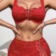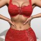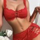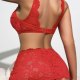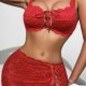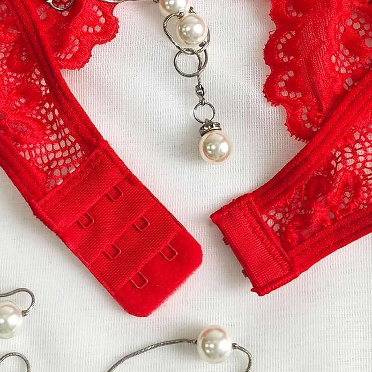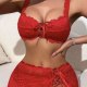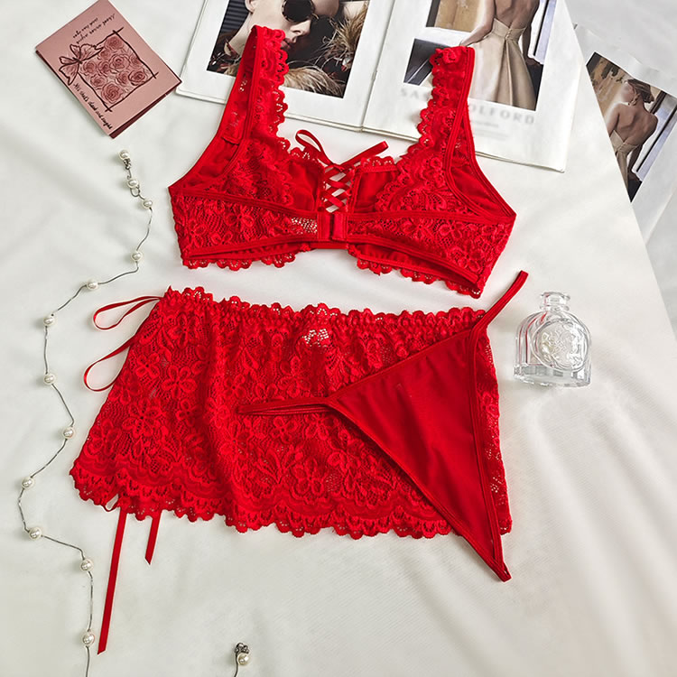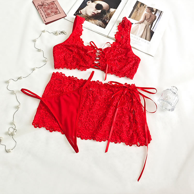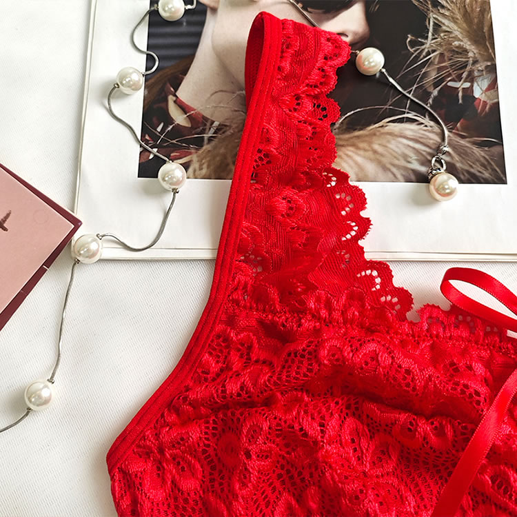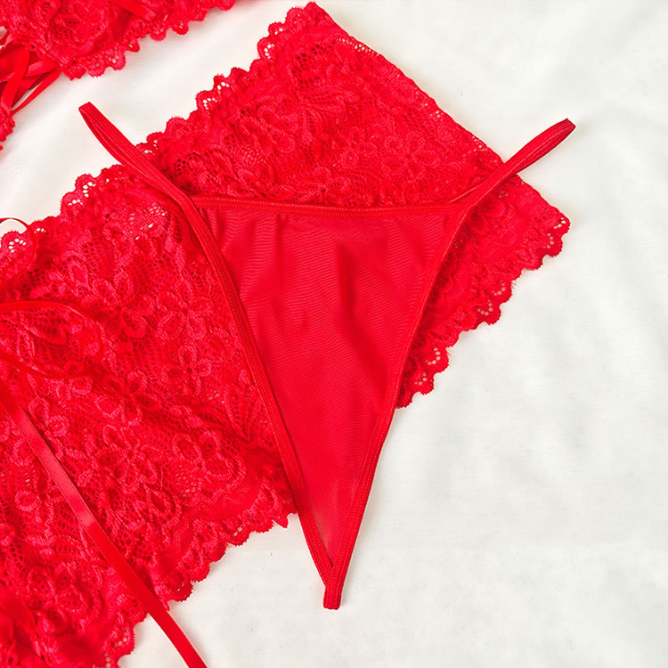 Designed with a classic yet daring flair, this red lingerie costume blends delicate floral lace patterns with functional details. The bra a bow-tie closure at the front, enhancing both style and adjustability. The matching mini dress sit high on the hips and include a crisscross lace-up side panel, adding visual interest and a snug fit. Together, they form a cohesive outfit ideal for confident wearers who love expressive styles.