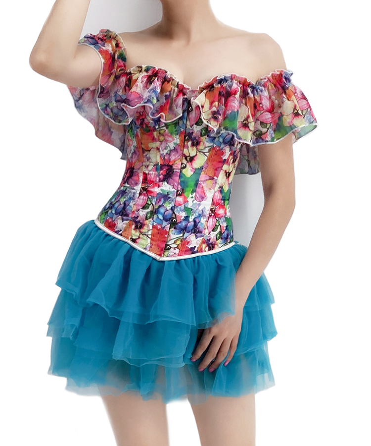 Ruffled Puff Sleeves Overbust Corset featured a flirty, low-cut, heart-shaped neckline. Front busk closure for easy wear, back lacing for cinching. The vintage floral corset contains 12 plastic bones that provide extra support for waist training for an hourglass figure. The beautiful corset can also be paired with skirts, shorts, trousers, etc., for various occasions.
