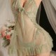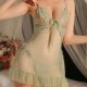 This enchanting babydoll set in a soft sage green hue evokes a sense of ethereal romance. Crafted from delicate, sheer dotted tulle, it features intricate floral lace trim along the V-neckline and hem. A charming satin ribbon bow adorns the center bust, adding a sweet, feminine touch. The set includes a matching lace thong, and the flowing, ruffled hem of the chemise creates a soft, flirtatious silhouette perfect for a special night.