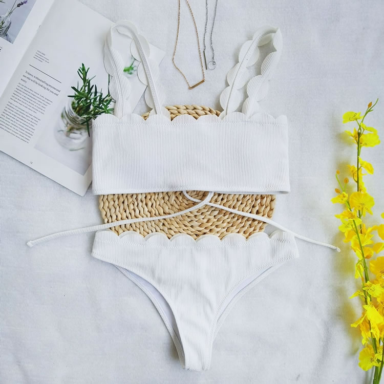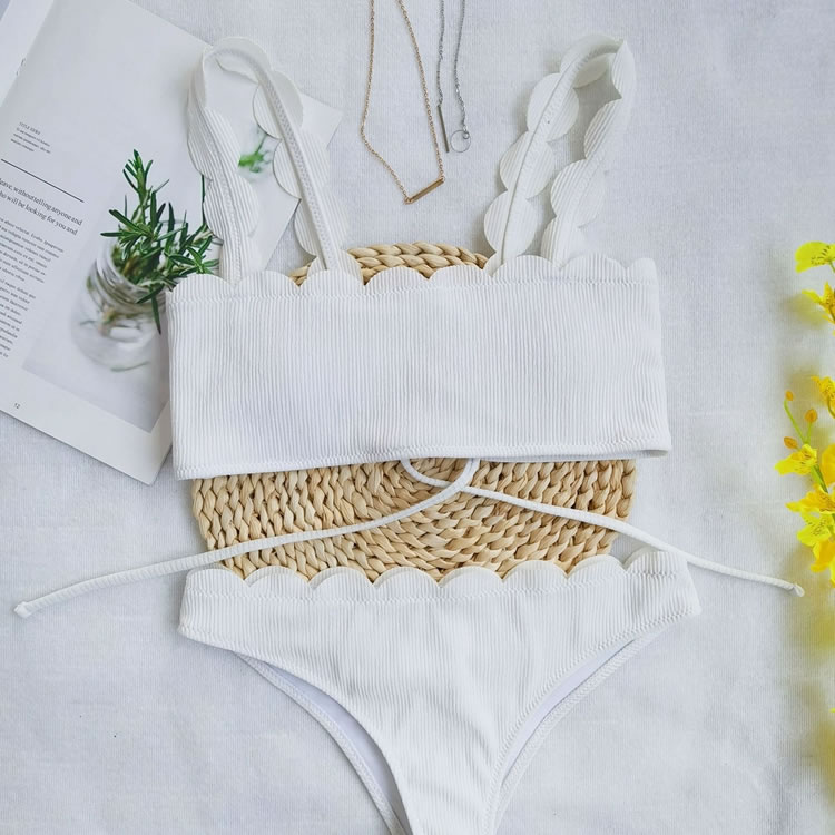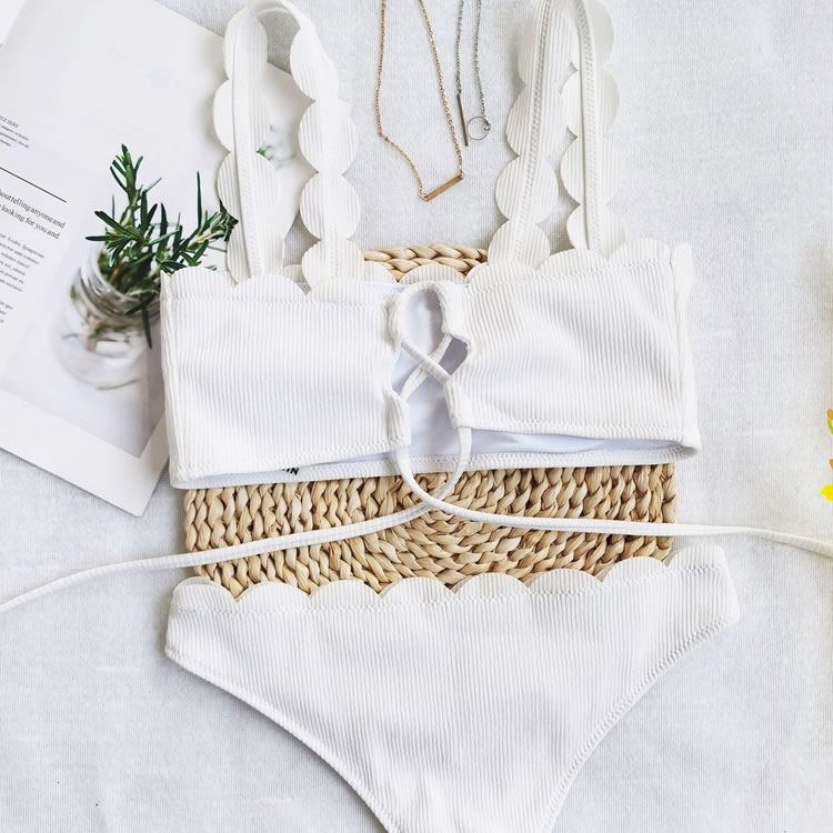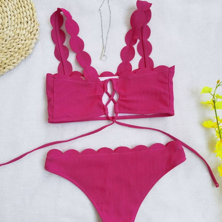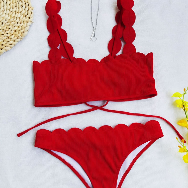 Take a break from the heat in this sexy bikini swimsuit featuring a square neckline, thick shoulder straps, lace-up back closure, a cozy ribbed fabric, and a matching bottom with a cheeky cut back.