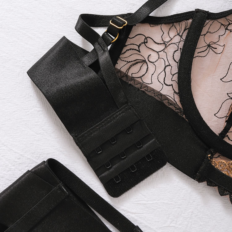 Indulge in the seductive allure of this black lace and mesh lingerie set. The bra features intricate floral lace detailing with sheer mesh panels, providing a blend of elegance and modern edge. The underwire cups offer support and shape, while the adjustable straps ensure a comfortable fit. The matching high-waisted garter belt and panty complements the set with its delicate lace trim and center seam, making it perfect for both intimate moments and special occasions.