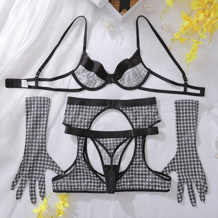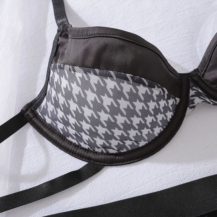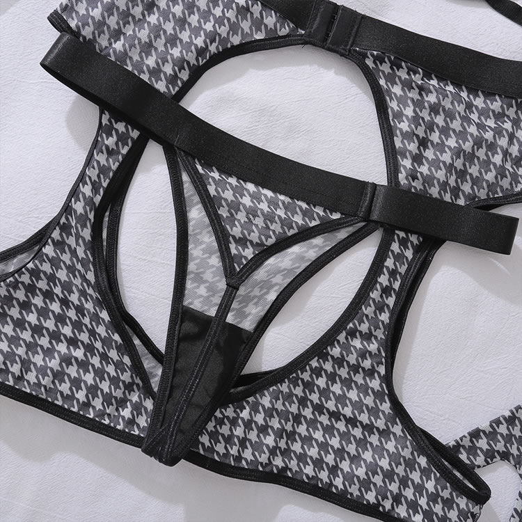 Step into seduction with this houndstooth ensemble. The bodysuit showcases a deep V-neckline and strategic cut-outs that enhance its appeal, paired with sheer fabric for added allure. The matching garter belt with intricate straps offers both style and support, creating a captivating look. Ideal for adding a daring and captivating vibe to your lingerie collection.