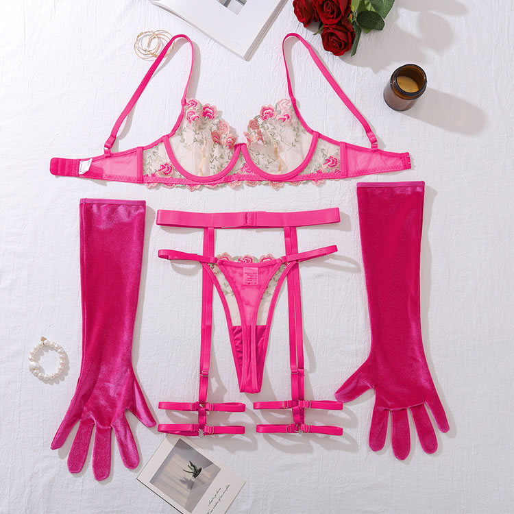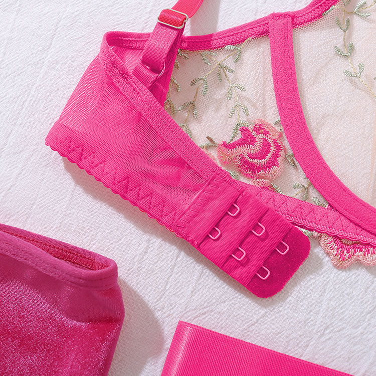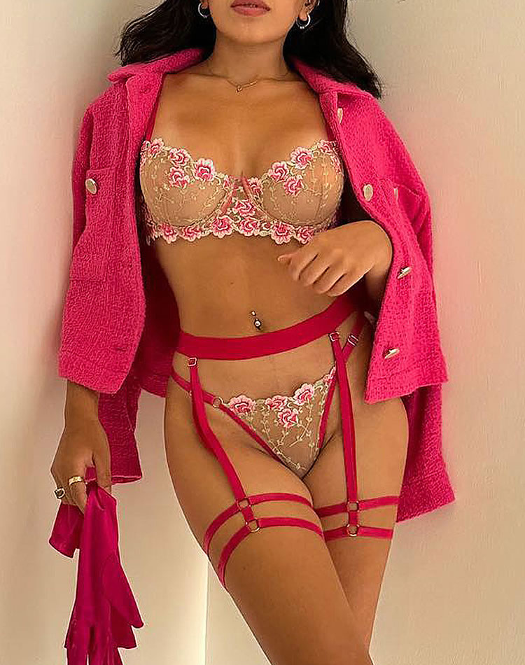 This bold pink floral lingerie set is a striking choice for those who love to make a statement. The bra features intricate floral embroidery that adds a touch of elegance and charm, while the matching garter belt ensures both style and support. The sheer fabric creates an alluring silhouette, making it perfect for anyone seeking a blend of confidence and allure in their intimates.