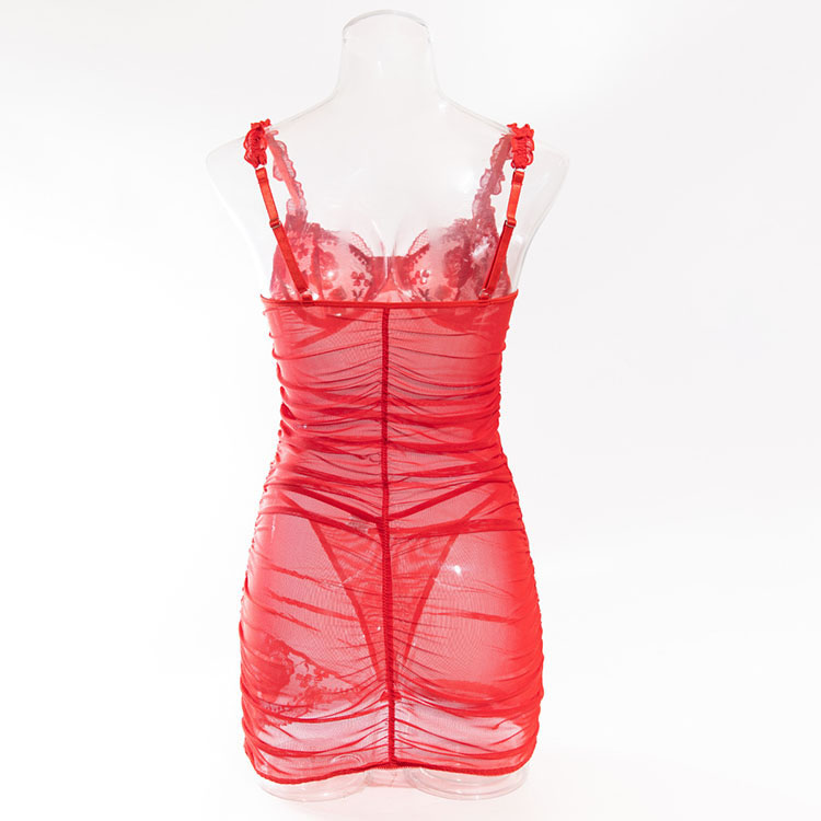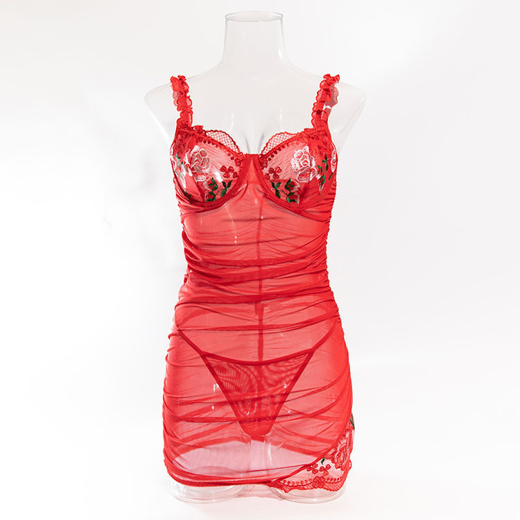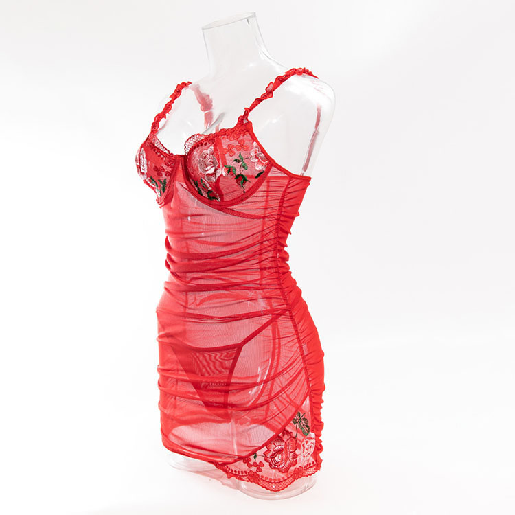 Elevate your intimate moments with this captivating red chemise. The sweetheart neckline is adorned with intricate floral embroidery, adding a touch of elegance and romance. The sheer mesh fabric enhances its allure, while the ruched design accentuates your figure beautifully.