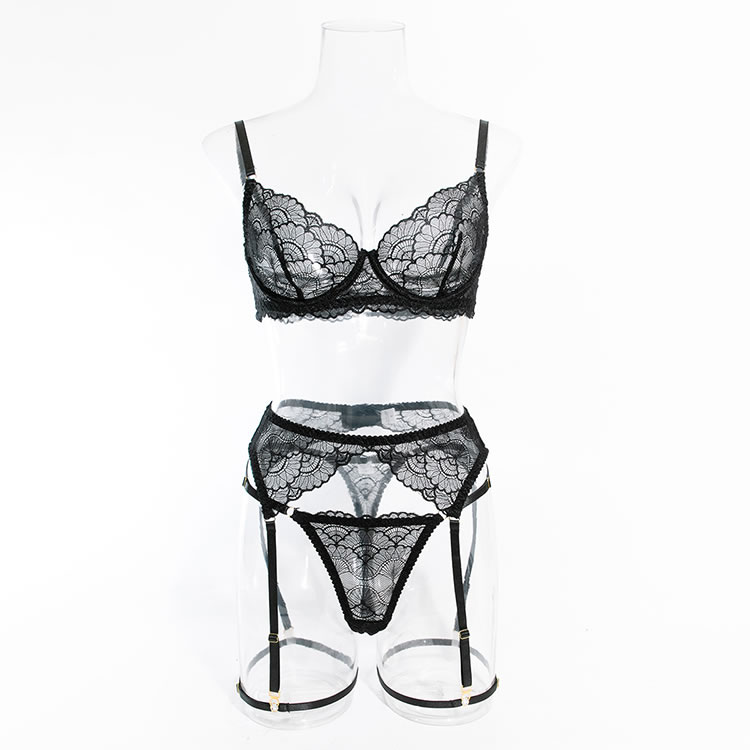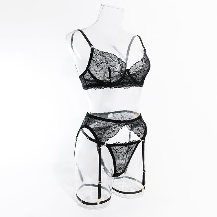Indulge in the seductive allure of this black lace lingerie set. The bra features intricate lace detailing with a scalloped edge, providing a blend of elegance and allure. The underwire cups offer support and shape, while the adjustable straps ensure a comfortable fit. The matching high-waisted panties complement the set with their delicate lace trim and center seam, making it perfect for both intimate moments and special occasions.