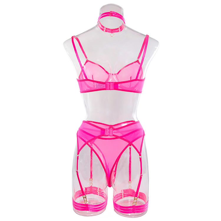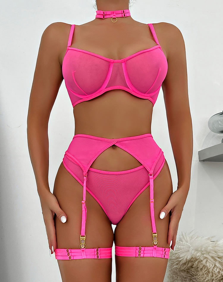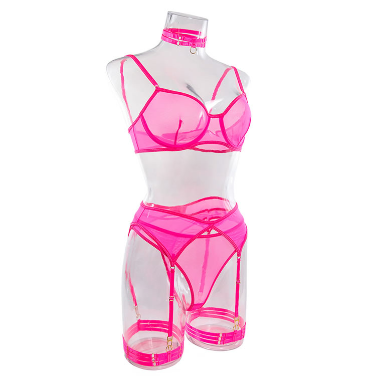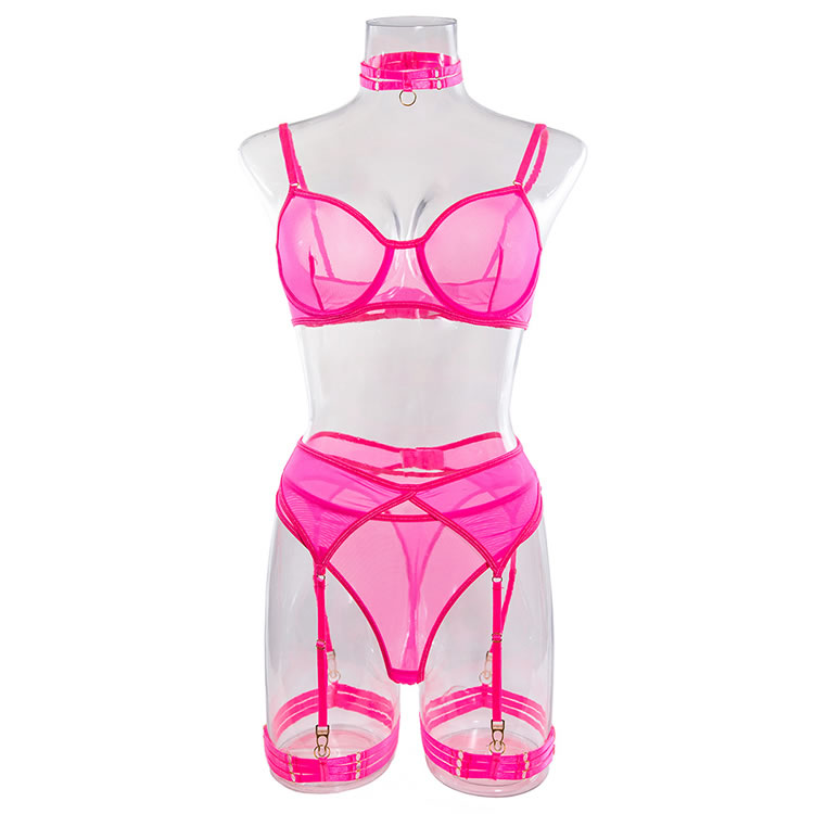 Show your love in the sexiest way you know how in this exclusive bra set featuring sheer mesh underwire cups, adjustable spaghetti straps, a hook and eye back closure, a matching panty with a cheeky cut back, and a matching high waisted garter belt with a hook and eye back closure, and adjustable garter straps, wraparound leg garters. (Choker included.)