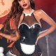 This daring Halloween maid costume combines bold style with playful charm. Featuring a high-shine black bodice with structured shaping, sheer mesh inserts, and delicate white lace detailing, it’s designed to turn heads at any party. The halter neckline ties at the back, offering a sleek and secure fit, while the flirty mini skirt with a classic apron front adds a touch of vintage flair. Complete the look with a pumpkin in hand and step into the spotlight with confidence.