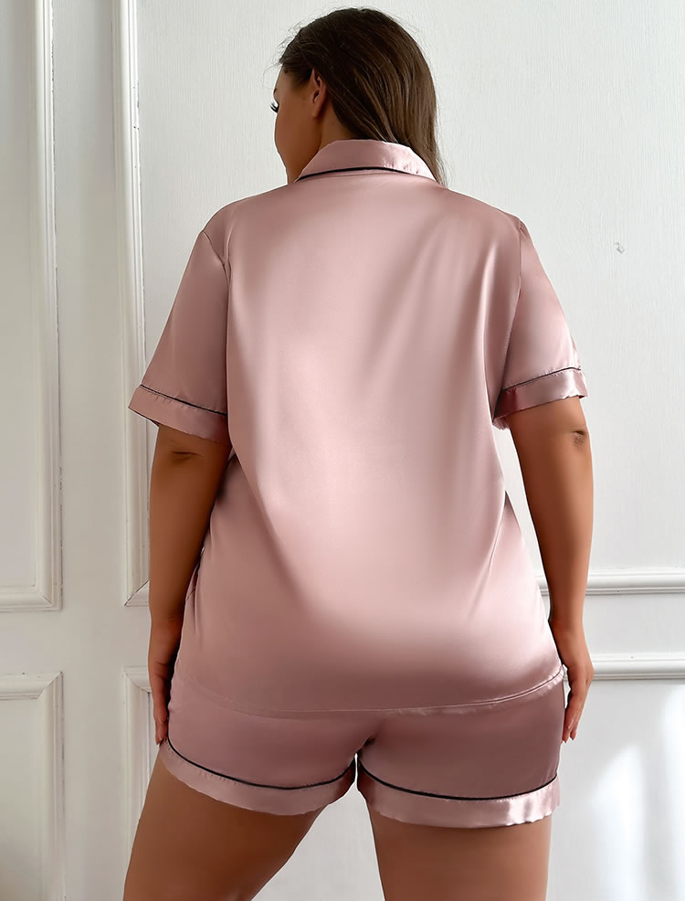 This elegant pink satin pajama set is perfect for anyone who values comfort and style. The short-sleeved top features a classic button-down design with black piping that adds a subtle contrast, while the shorts offer a relaxed fit. The smooth fabric feels soft against the skin, ensuring you stay comfortable all night long.