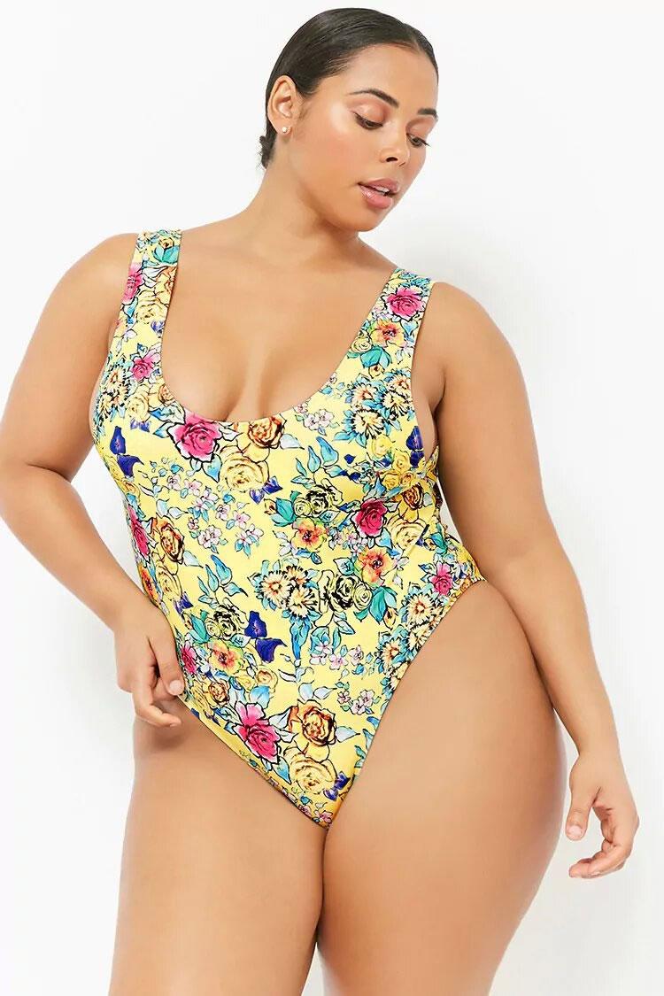 Stylish plus size bathing suit featuring a scoop neckline, and a low back, high cut leg design and cheeky fit, allover floral print.