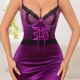 This striking purple lingerie dress blends bold color with classic design elements for a captivating look. The top features a lace-trimmed bralette with a deep V-neckline and a central bow detail, adding a touch of romance. A corset-style lace-up panel at the waist enhances the silhouette, drawing attention to the curves. The smooth skirt hugs the body perfectly and is finished with a delicate black lace hem, while the open back with a keyhole cutout adds a daring flair. Ideal for intimate evenings or making a statement in style.
