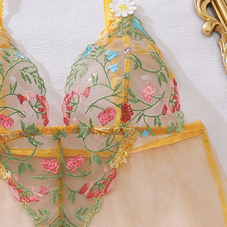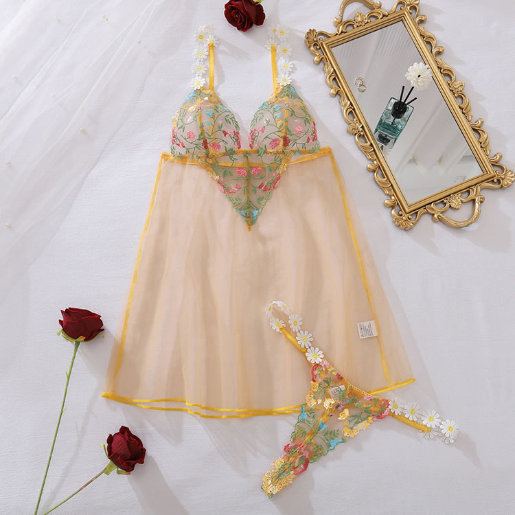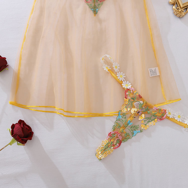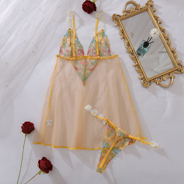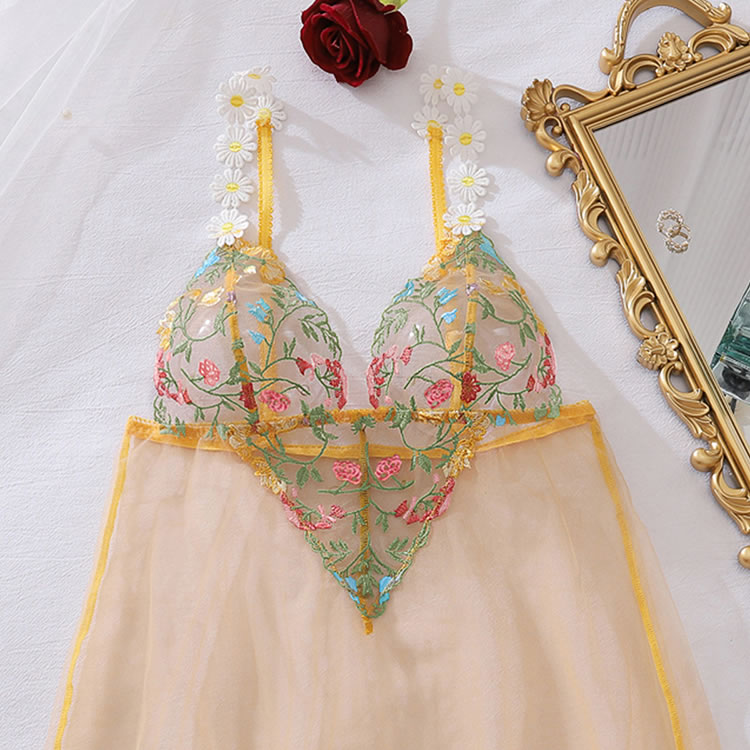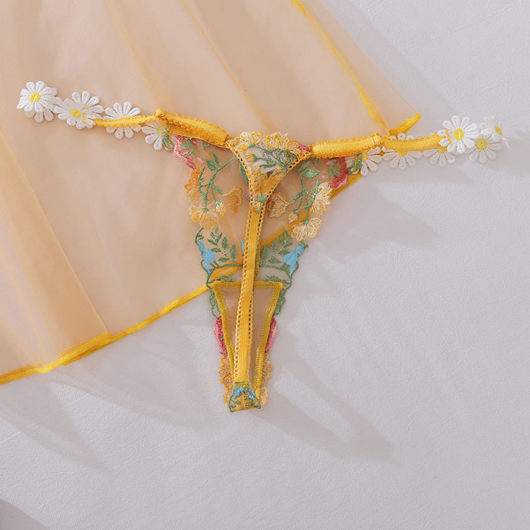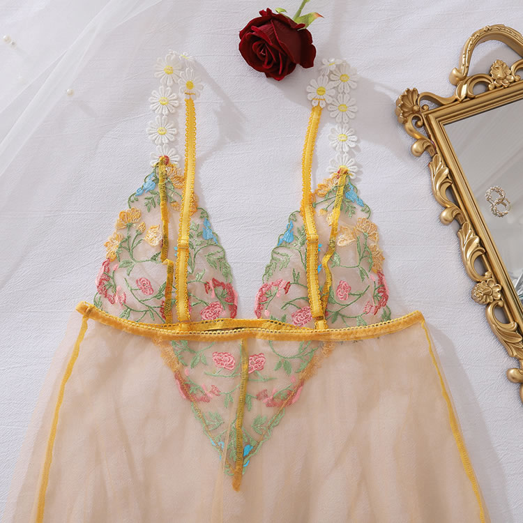 This sheer babydoll chemise features a delicate mesh construction adorned with vibrant, multi-colored floral embroidery. The design highlights a plunging V-neckline and adjustable spaghetti straps decorated with a charming 3D white daisy chain. The bodice showcases intricate pink, blue, and yellow stitching that extends down to the matching G-string. Finished with yellow piping along the hem and a flowing, lightweight skirt, this set offers a playful and romantic aesthetic perfect for a soft, feminine look.