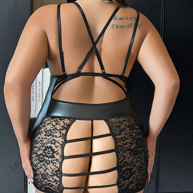 Own the night in this daring black mini dress that blends sleek faux leather with delicate floral lace. The deep V-neckline frames your curves, while adjustable crisscross straps at the back let you customize the fit — no digging or slipping. Sheer lace panels and horizontal strap cutouts at the hips add edge without sacrificing comfort. Perfect for date nights, boudoir moments, or whenever you want to feel powerful in your own skin.