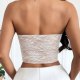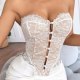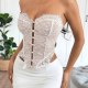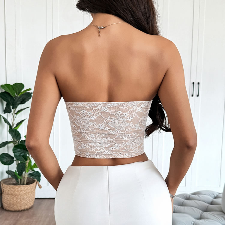 Embrace a romantic aesthetic with this delicate white lace bustier. Designed with a strapless sweetheart neckline, it features intricate floral lace overlaying panel. The front is accented with a row of charming fabric-covered buttons that add a touch of vintage-inspired detail. Perfect for layering under a blazer for a night out or pairing with a skirt for a special occasion, this piece adds a feminine and alluring element to any ensemble.