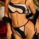 Command attention with this daring and modern lingerie set, designed for the bold and confident. The bralette features a striking design with sheer nude mesh panels framed by bold black trim in a swirling, abstract pattern. Paired with matching thong bottoms that echo the sheer panel aesthetic, this set creates a captivating visual effect. Adjustable straps and a classic hook-and-eye back closure ensure a secure and comfortable fit, making it a perfect choice for a provocative night.