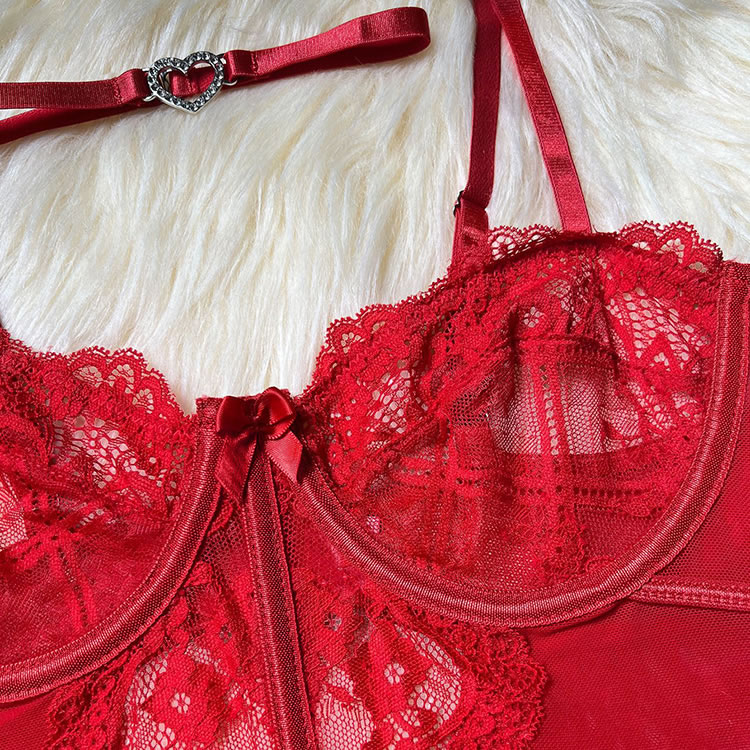 This alluring chemises combines romantic lace with modern cutouts for a bold yet feminine statement. The front features underwire cups framed by intricate floral lace, while semi-sheer mesh panels and strategic openings at the waist create a teasing, sculpted effect. Adjustable shoulder straps and functional garters connect to matching lace-top thigh highs for a cohesive head-to-toe look. The back reveals an open crisscross strap design that adds drama and movement. Finished with coordinating wrist ties and a heart-choker necklace, this set is perfect for those who love detailed, head-turning intimate wear.