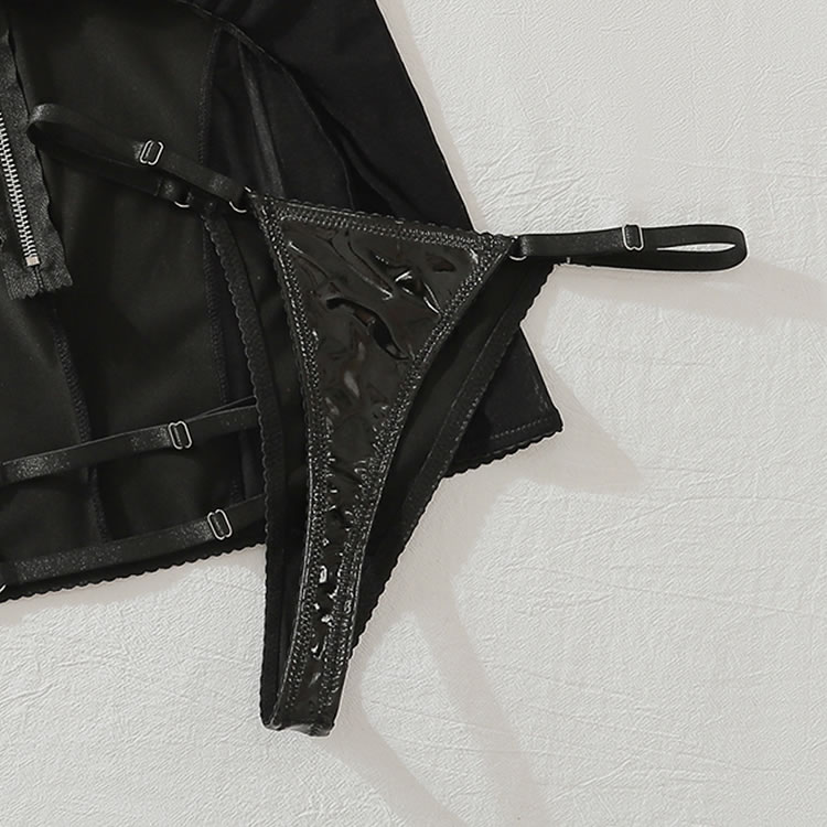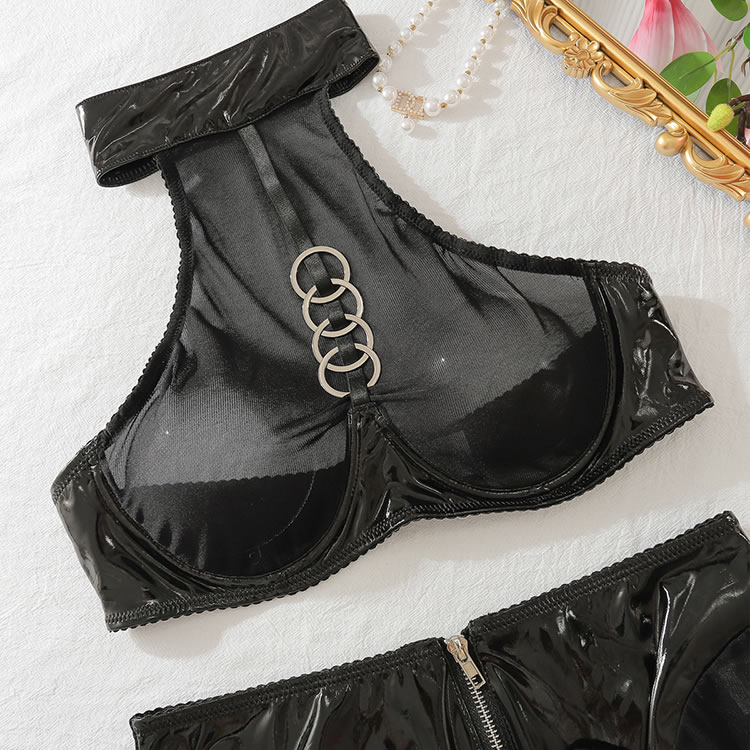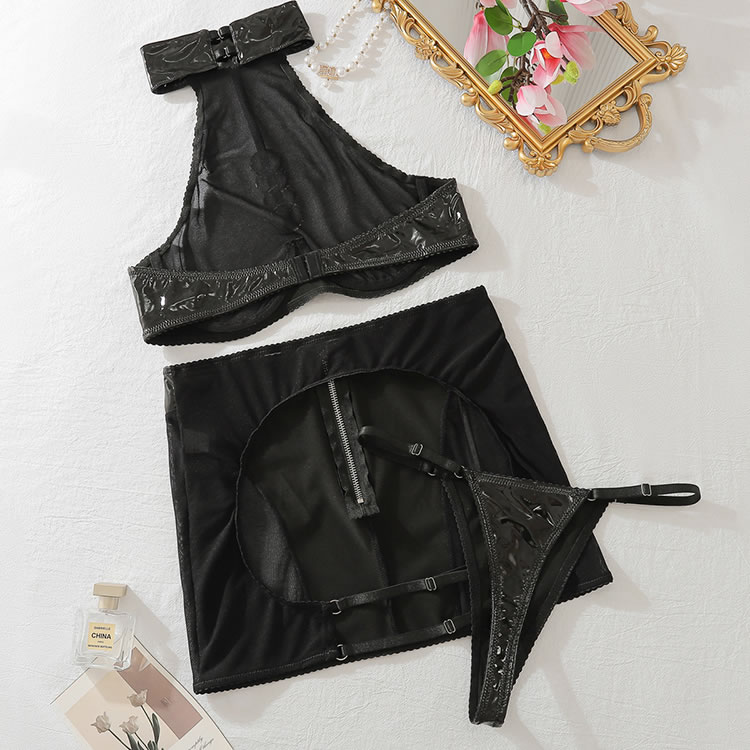 This lingerie set combines sheer mesh with faux leather for a bold and seductive look. The halter neck top features a central ring detail that adds an edgy touch, while the high-waisted skirt with a front zipper offers a sleek and modern silhouette.