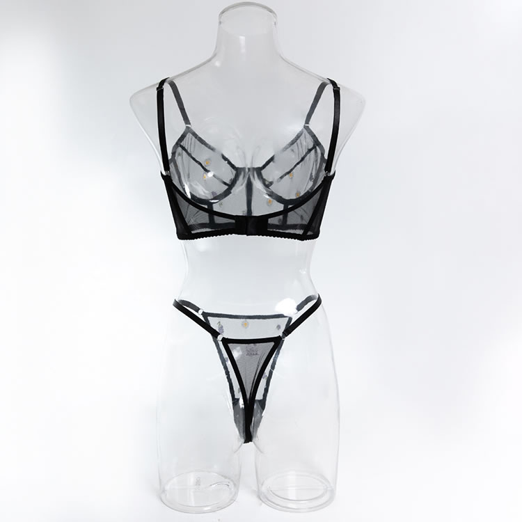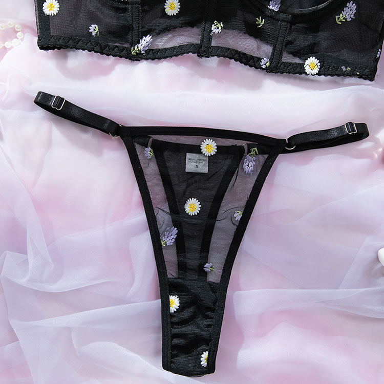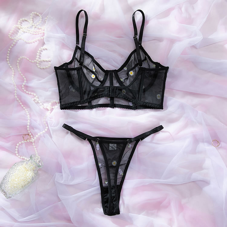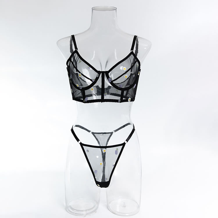 This sheer mesh lingerie set features a bold, modern design with delicate floral embroidery that adds a playful touch to its edgy silhouette. The bra showcases structured underwire support with thin straps and a wide back band for comfort, while the matching thong offers minimal coverage with a sleek triangle cut. Designed to highlight natural curves, this set is perfect for those who love a daring yet feminine look.