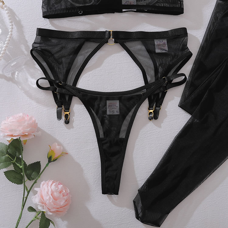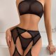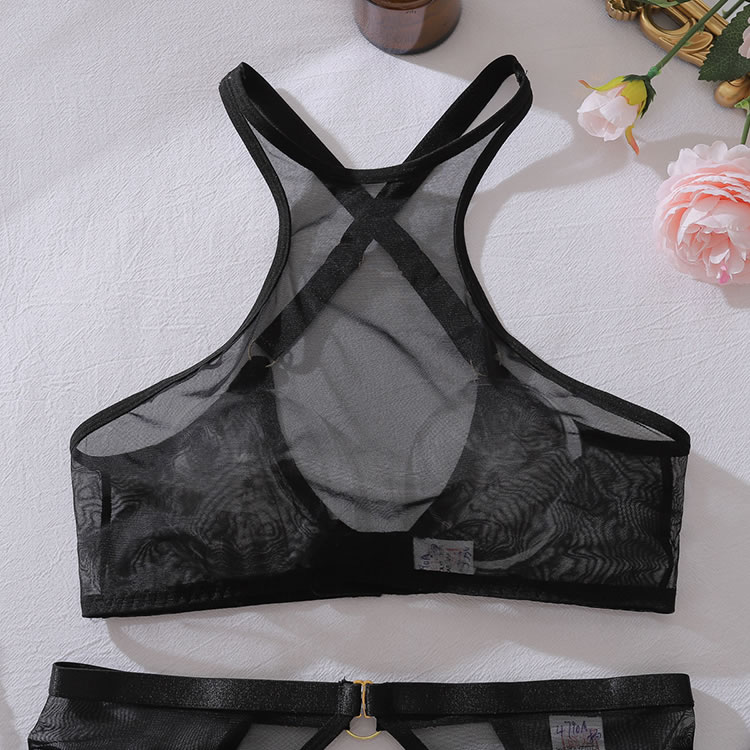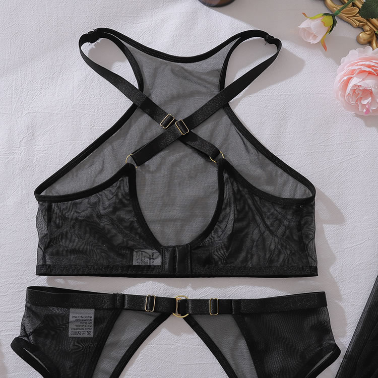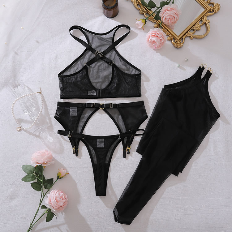 Sheer Mesh Halter Top Lingerie Set with Strappy Garter Panties and Stockings