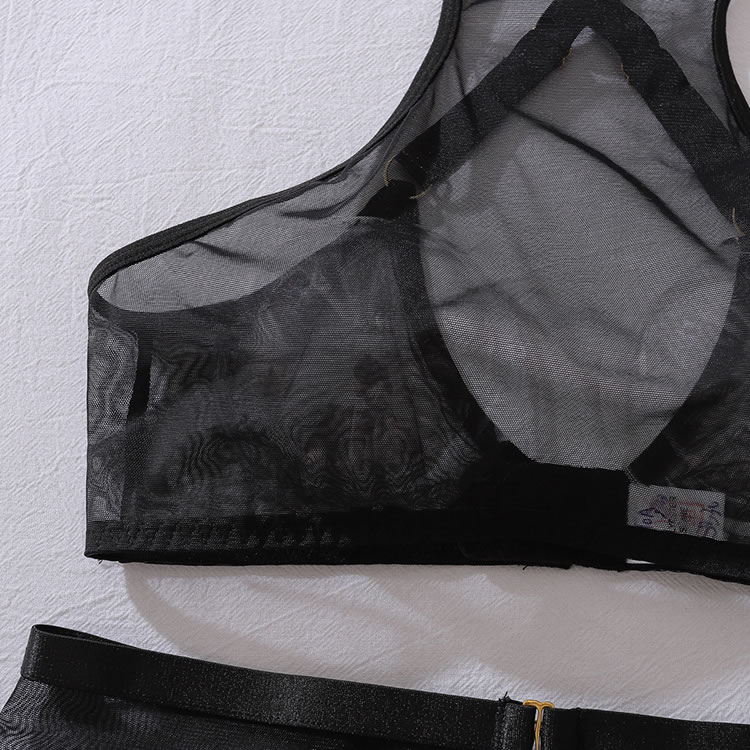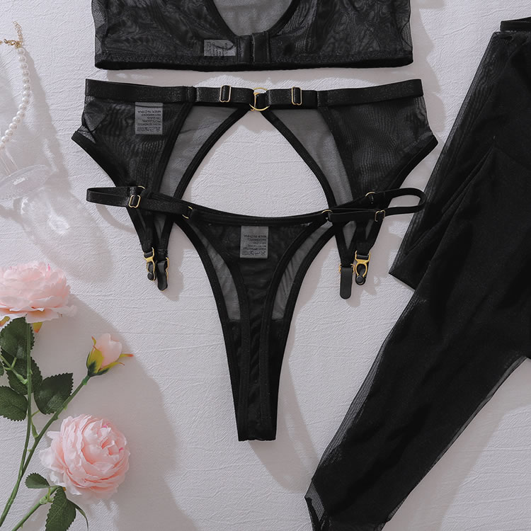 Make a bold statement with this daring and modern lingerie set. The design features a sheer, high-neck crop top that offers a teasing glimpse of skin, paired with strappy high-waisted bottoms. Multiple straps with metallic hardware create a captivating cage-like effect, drawing the eye and accentuating your curves. The set seamlessly connects to sheer, back-seam stockings for a look that is both edgy and undeniably sensual.