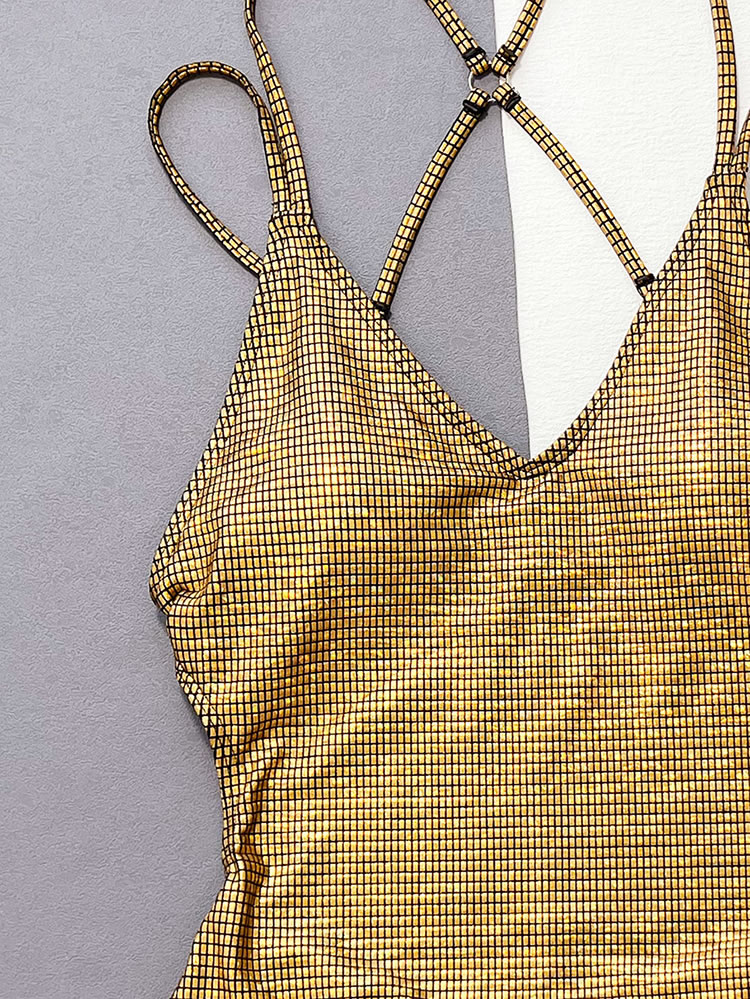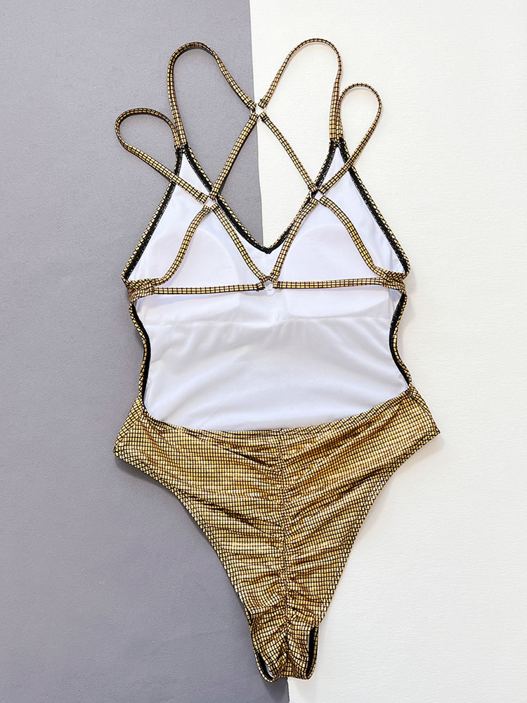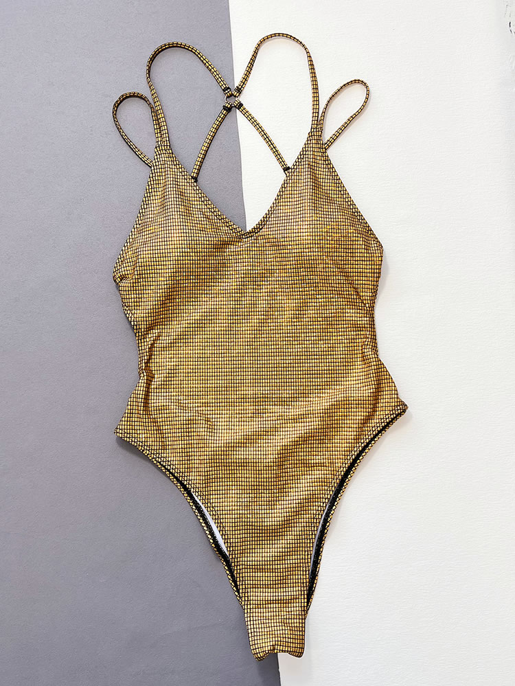 Shine bright in this shimmering gold one-piece swimsuit, featuring a captivating crisscross back design. The sparkling details catch the light, making it perfect for those who want to dazzle at the beach or poolside. The flattering cut ensures you feel confident and stylish.