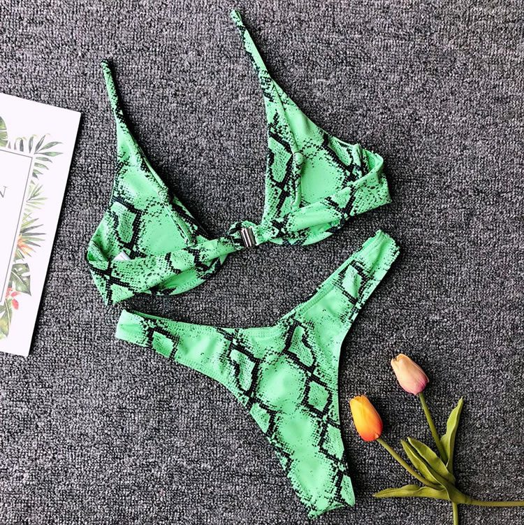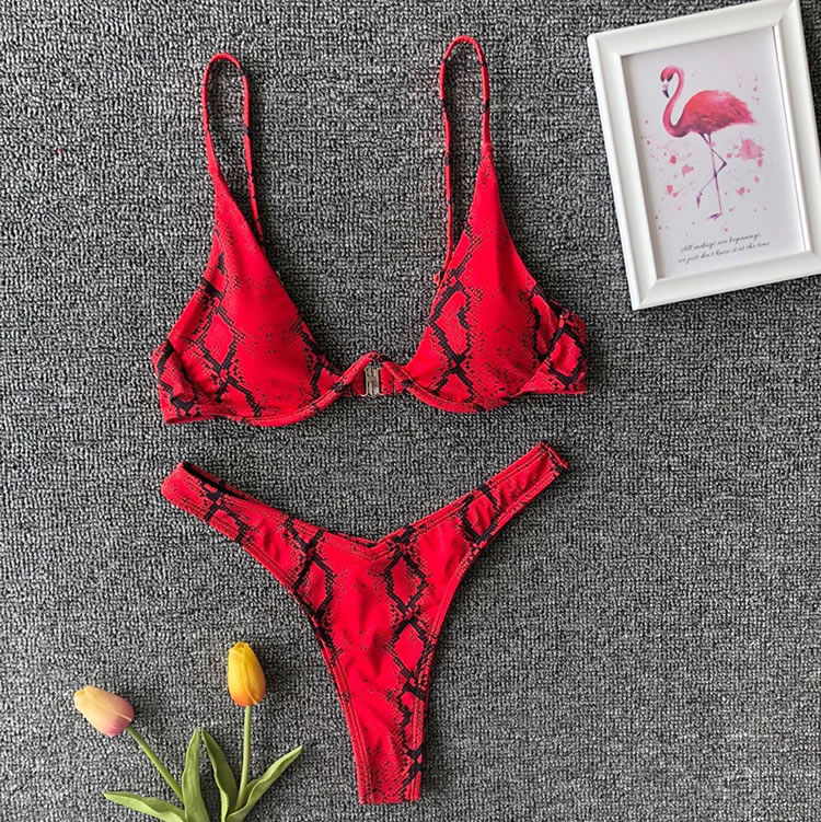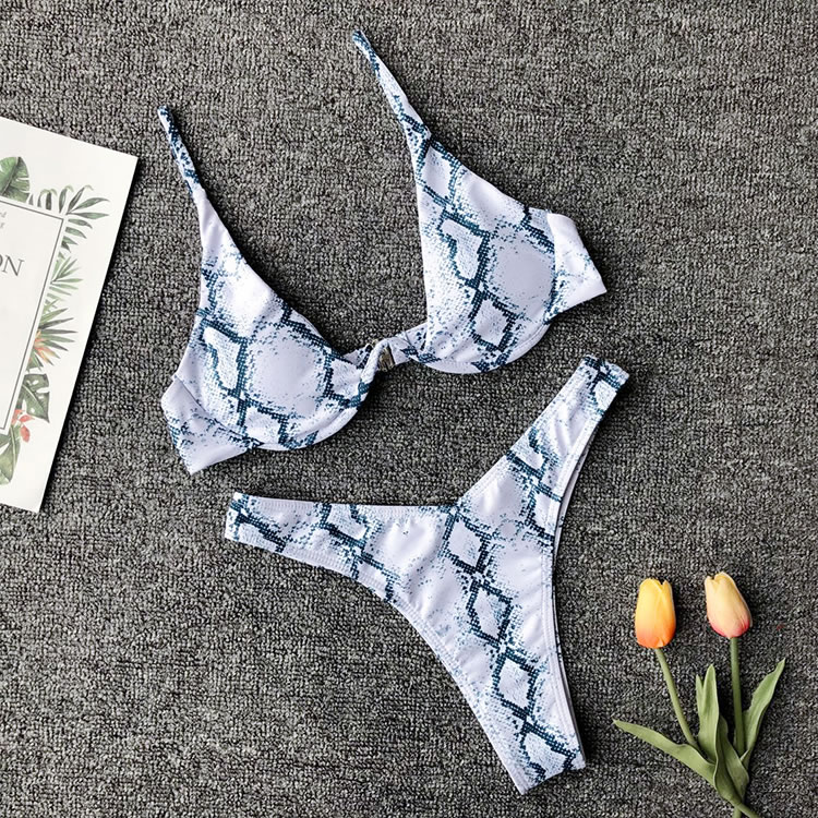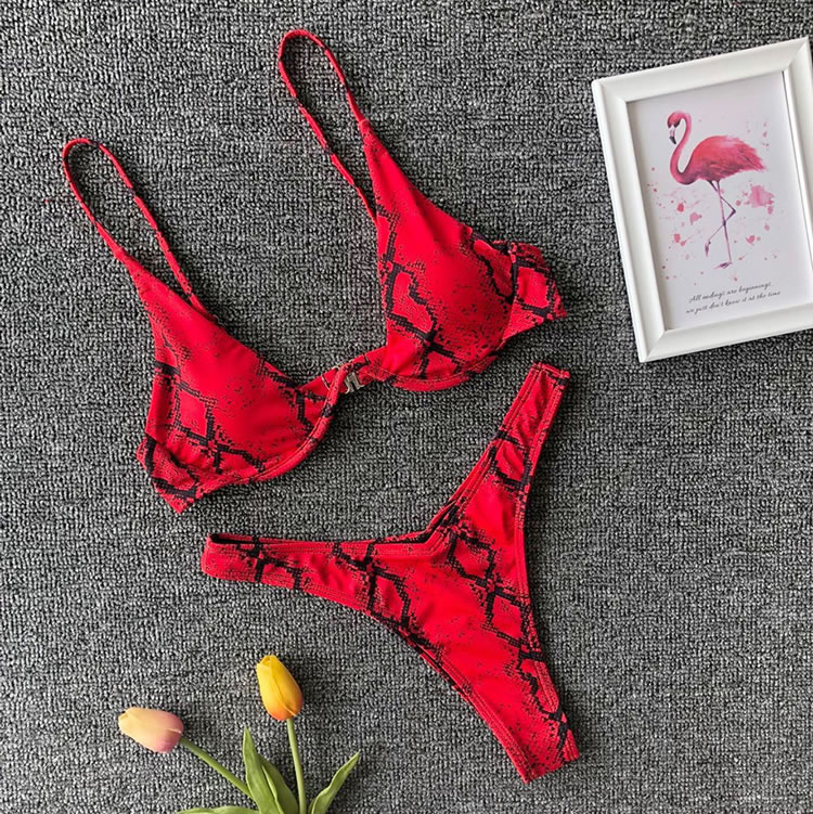 It's time to rep-style in the sun with this exclusive swimwear featuring underwire cups, a snake print, adjustable spaghetti straps, a back hook closure, matching bottoms with a low cut front, high cut sides, a thong cut back.