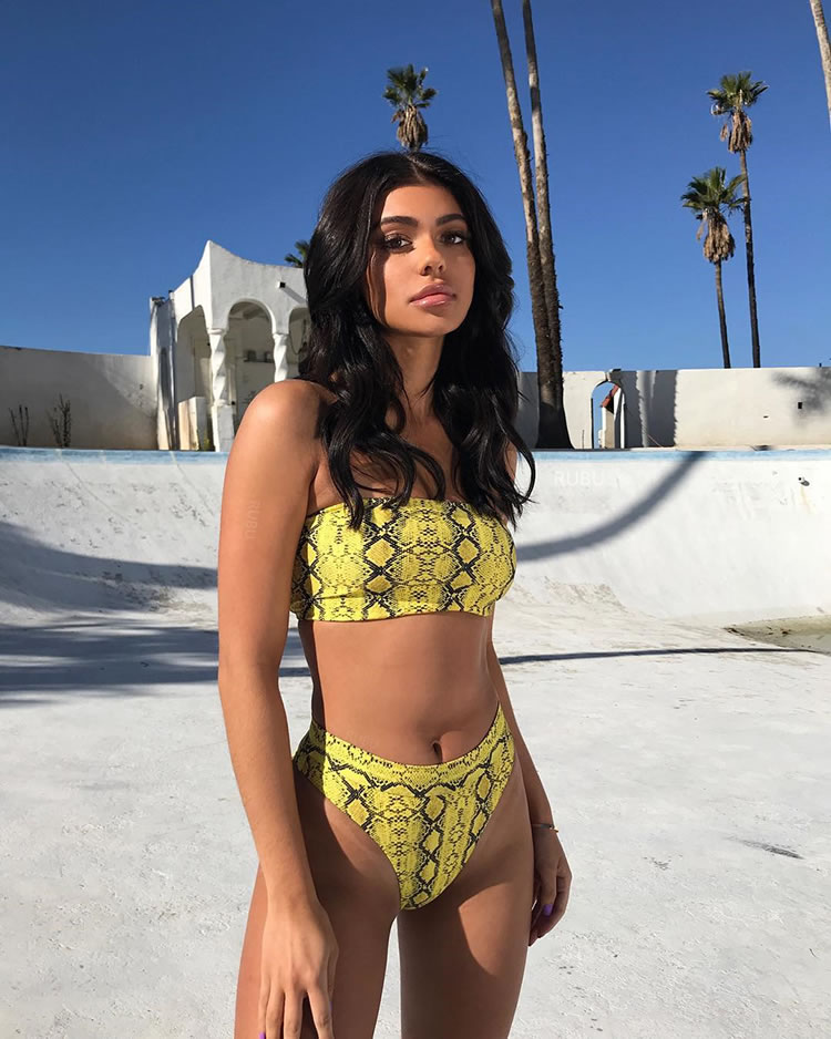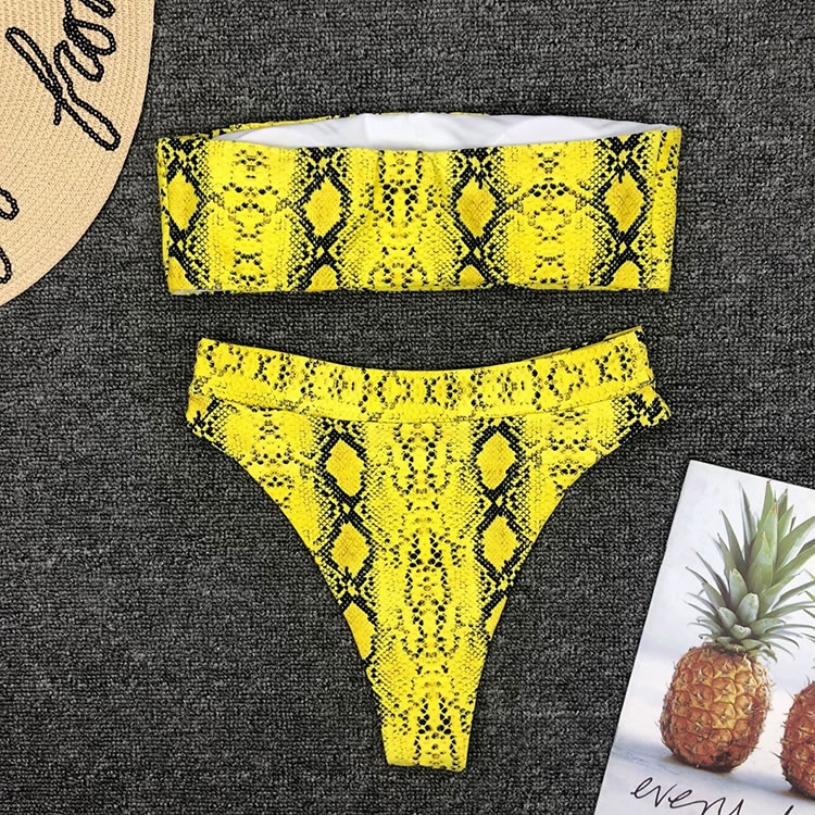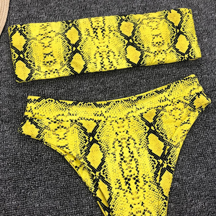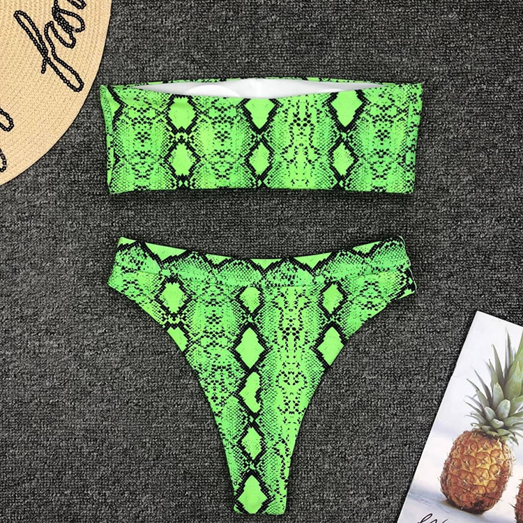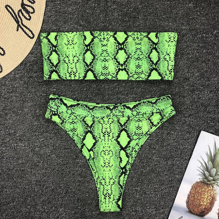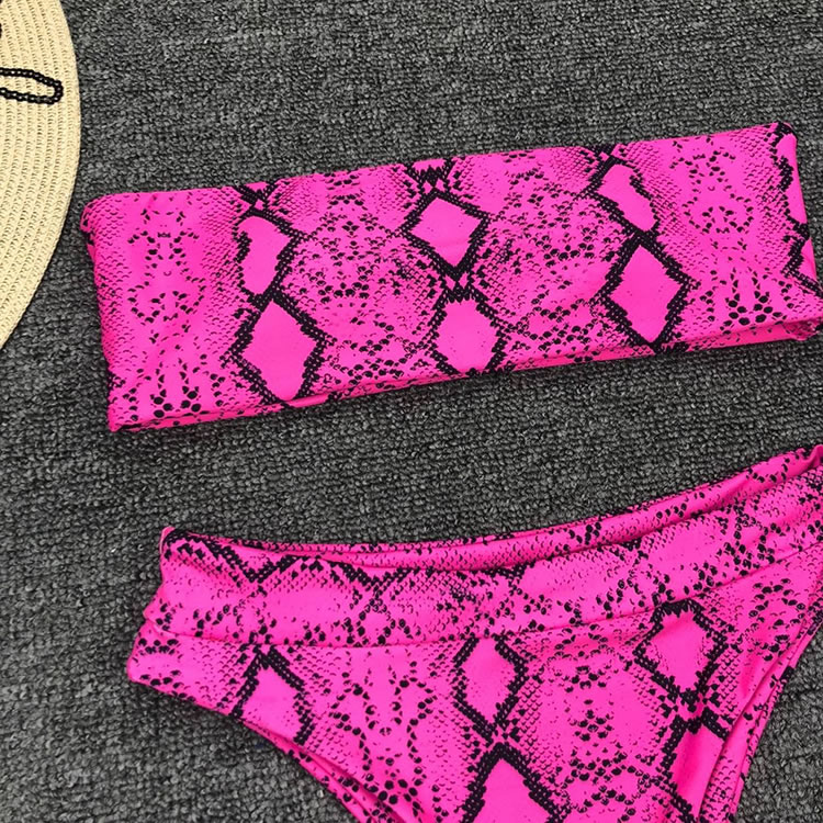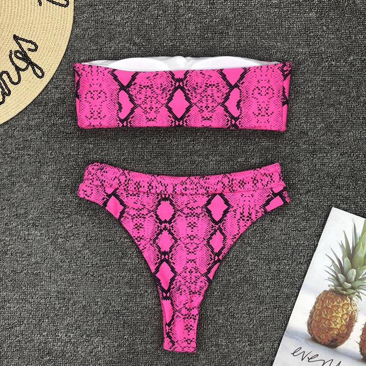 Wild look two piece bikini set featuring a sliding triangle bikini swim top with detachable pad cups, adjustable straps tied on neck and back, and a pair of cheeky bikini bottom with strings on sides. Allover in snake printed.