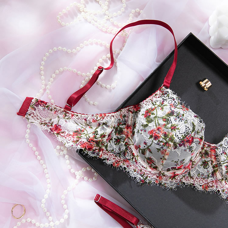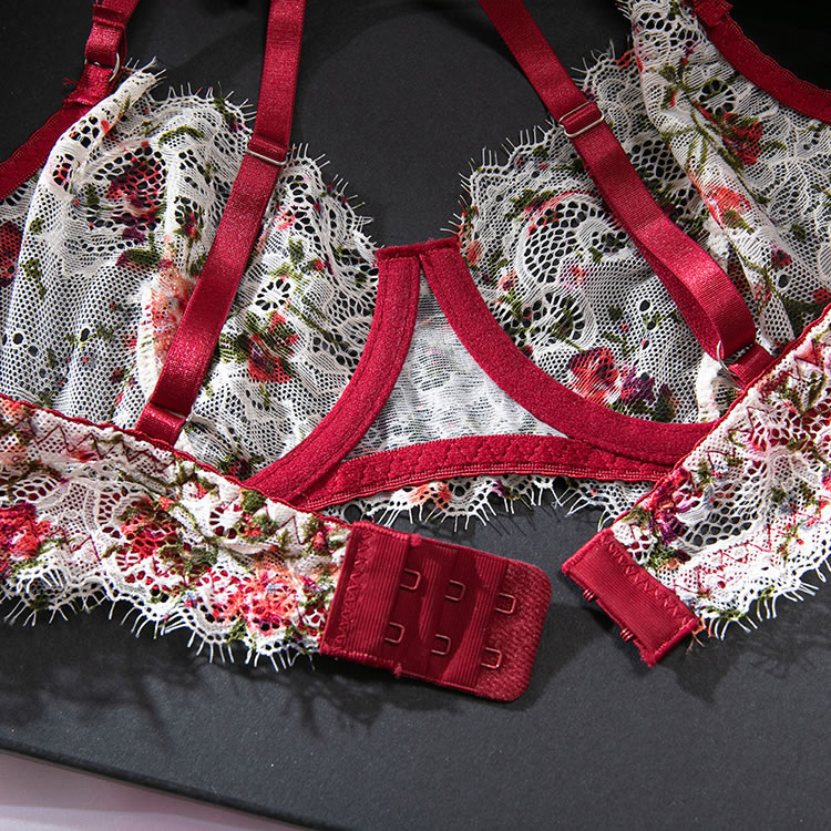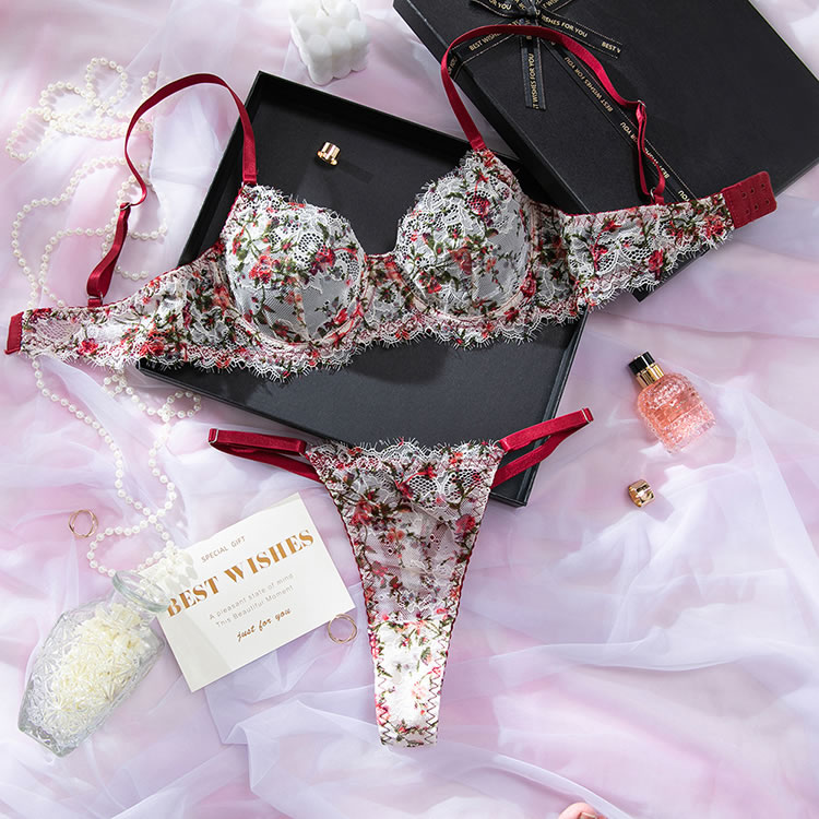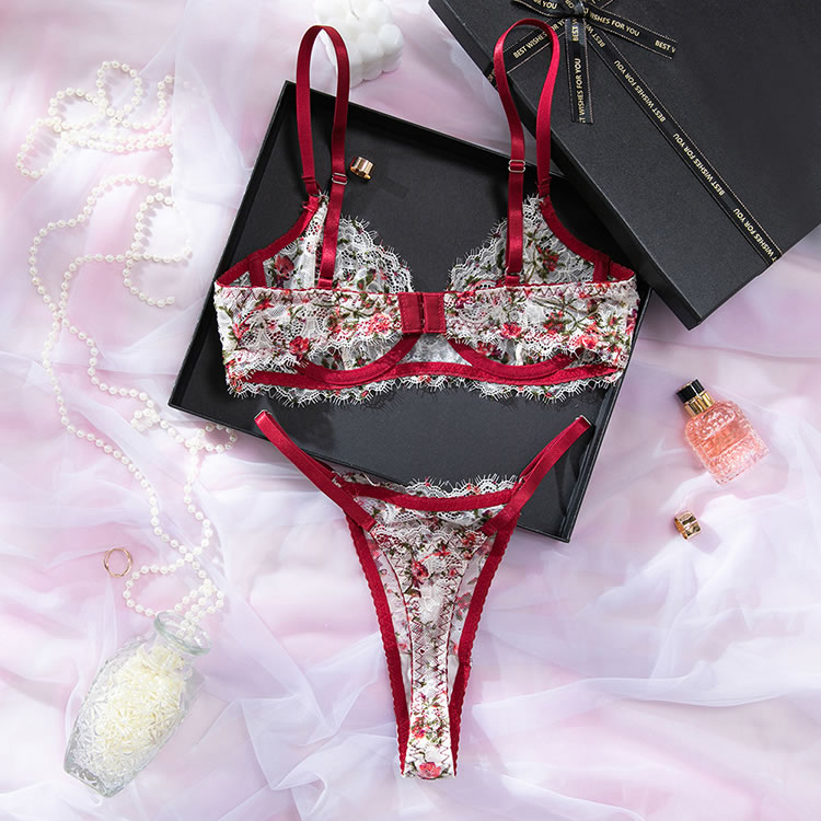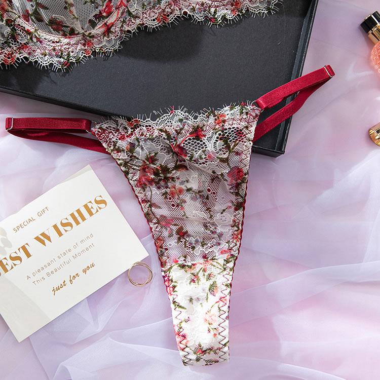 This elegant floral lace lingerie set features a delicate blend of soft mesh and intricate floral patterns, offering a romantic and feminine look. The bra showcases adjustable straps for a flattering fit, while the thong-style bottom highlights a minimalist silhouette with bold contrast trim. Designed for comfort and style, it’s perfect for adding a touch of charm to intimate moments.