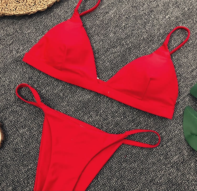 This bikini features triangle cups, adjustable spaghetti straps, and a hook back closure, and matching bottoms with a cheeky cut back.