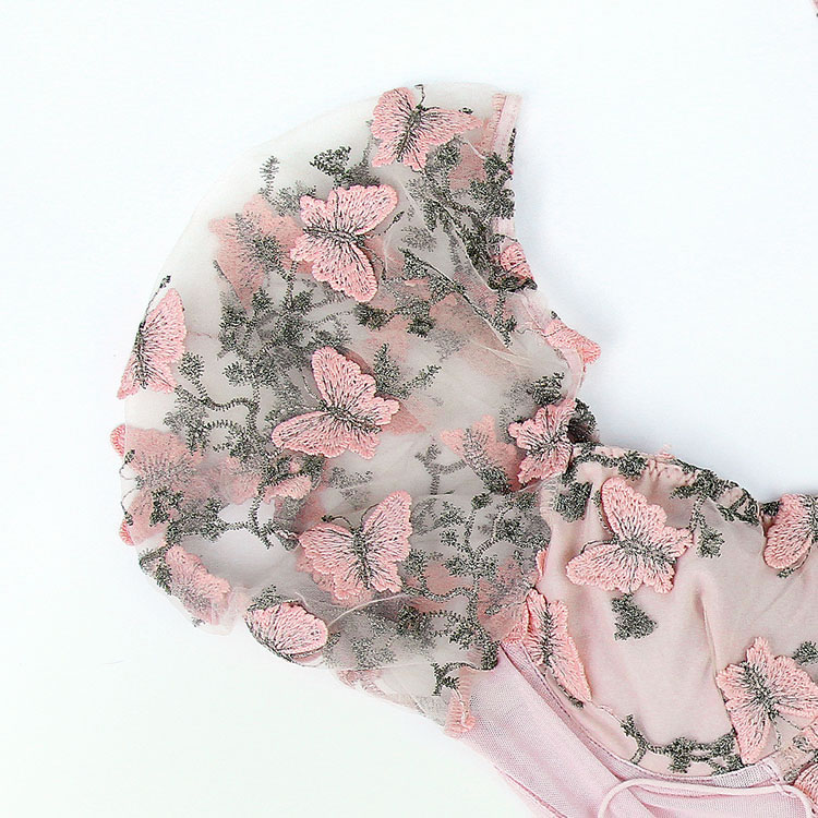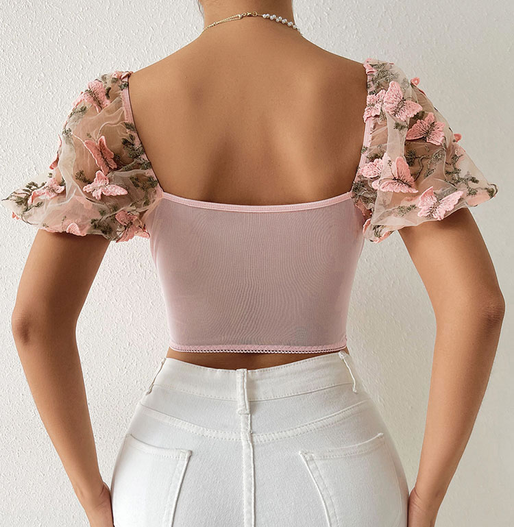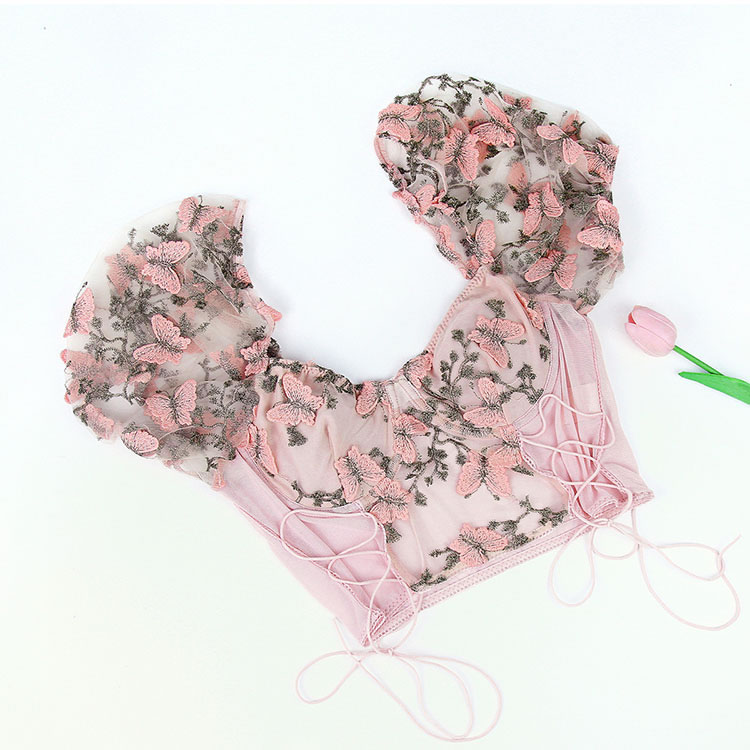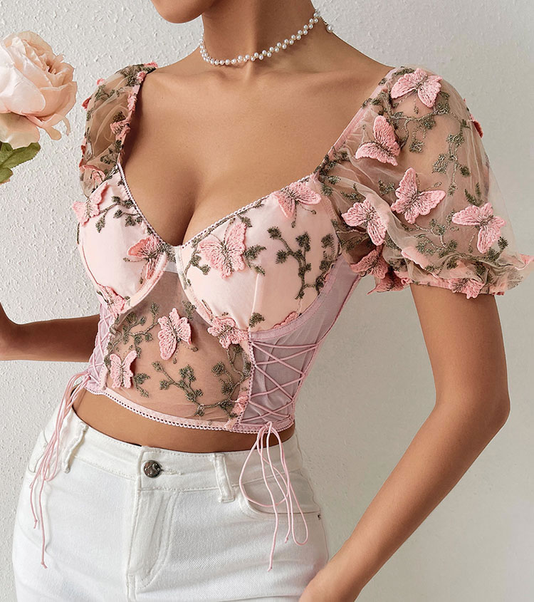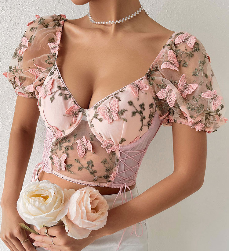 Experience the blend of chic design and versatility with this pink corset top. The soft sheer mesh fabric and intricate butterfly and floral embroidery offer both comfort and style. Whether paired with jeans or a skirt, this top is a must-have for any wardrobe.